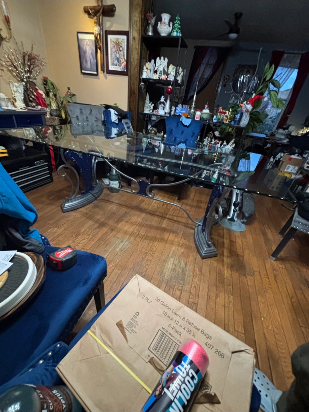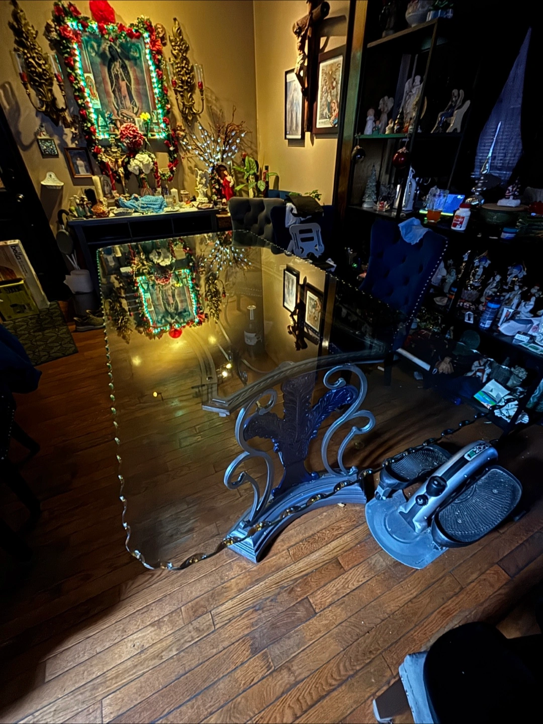 Selling a glass top dining table. It has a unique and decorative base. The glass top is large and clear, perfect for a dining room or large kitchen. It's in good condition and ready for a new home! Chairs not included