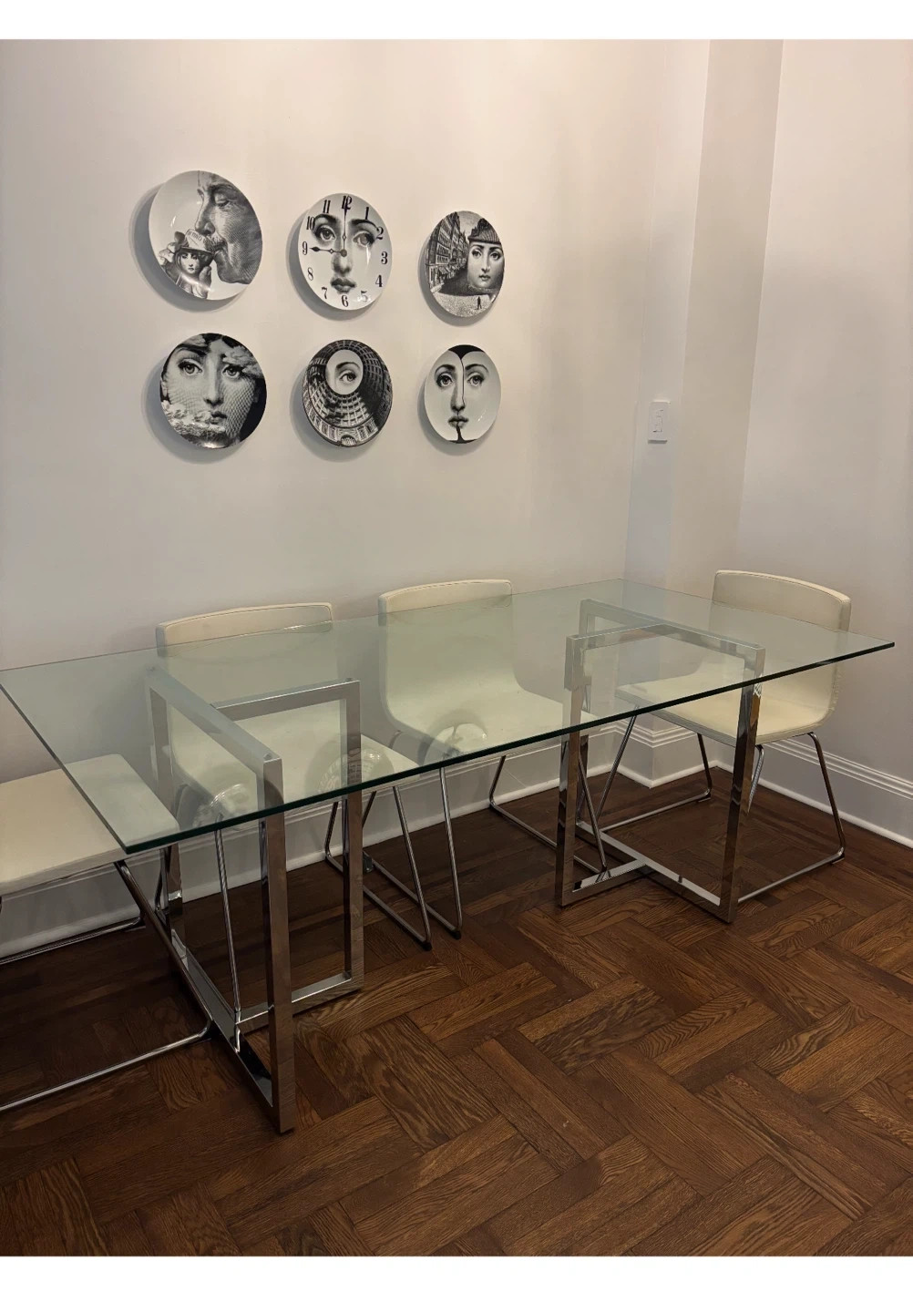 19Selling a glass top dining table with four chairs. The table features a clear glass top and chrome legs. The chairs have a cream-colored seat and back, and chrome legs to match the table. Great for a modern dining space!