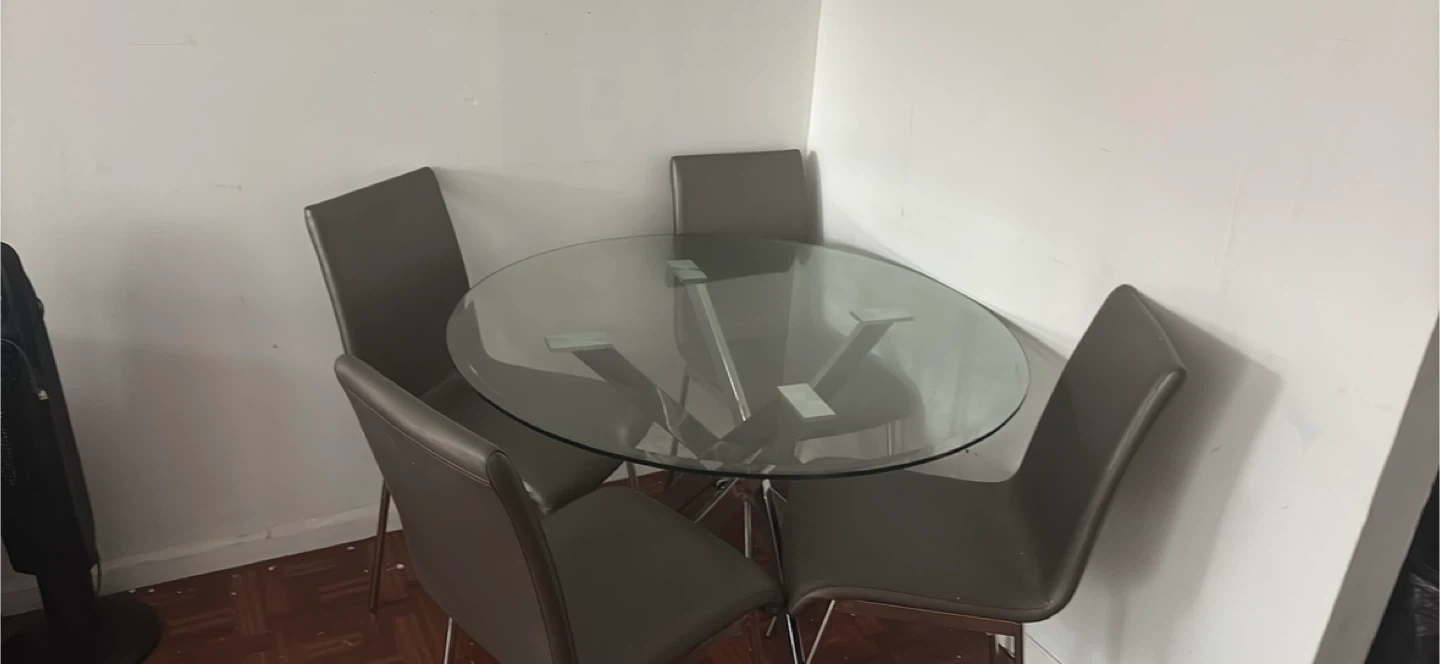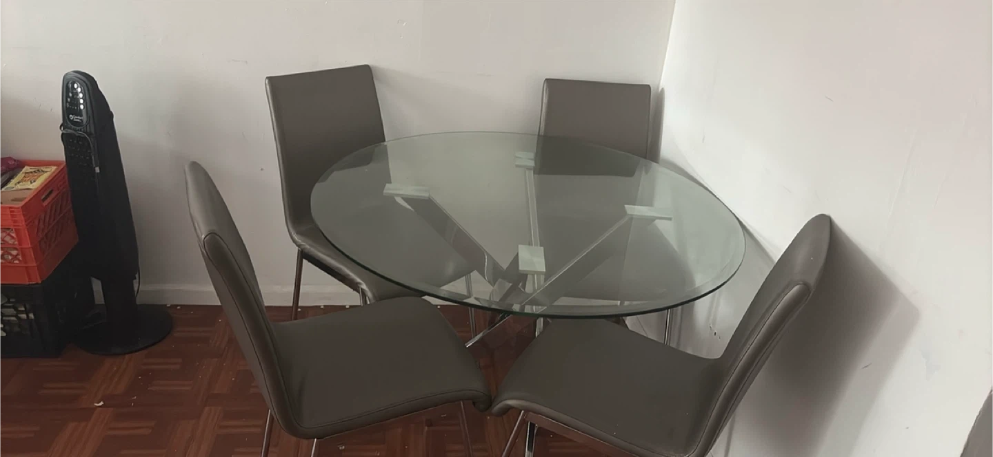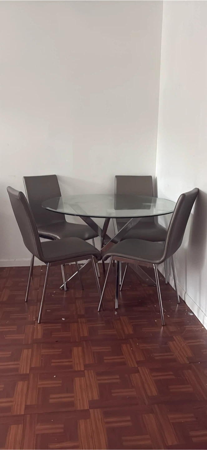 10Selling a glass top dining table with four chairs. The table features a clear glass top and a modern design with metal legs. The chairs are upholstered in a neutral color that complements the table. Perfect for a small dining space!