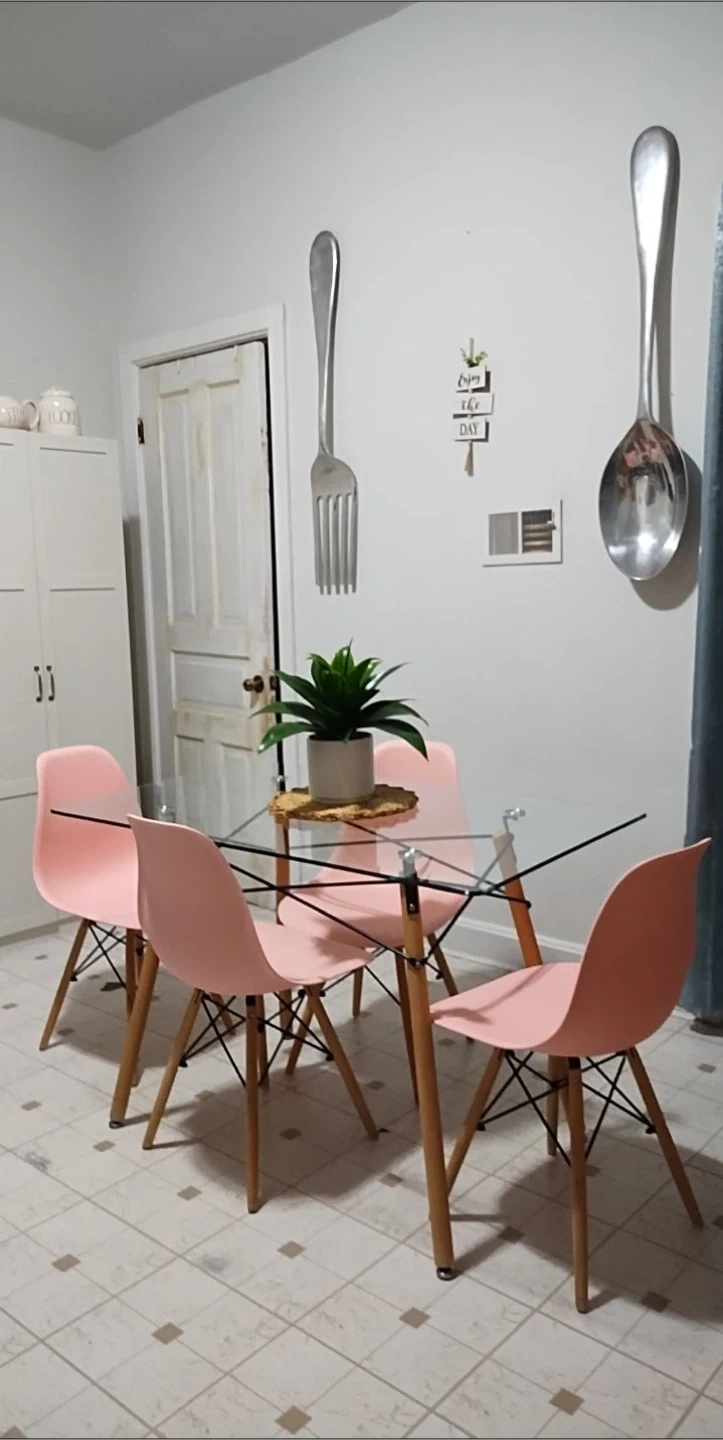 Selling a dining table with a glass top and four stylish pink chairs! This set would look great in any y tu dining room or kitchen space. The chairs have a modern design with wooden legs and a comfortable seat. It's in good condition and ready for a new home