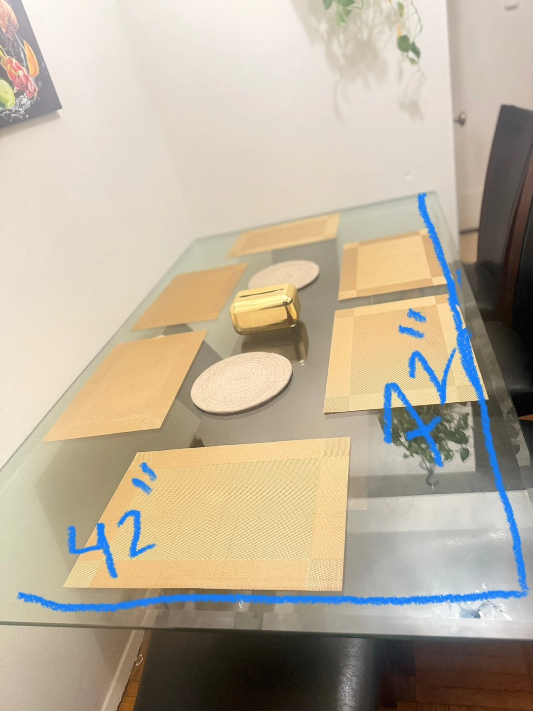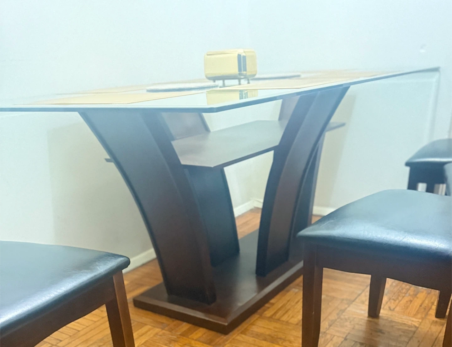 60Dining table set with glass top and 6 chairs. The table is rectangular, approximately 72" L × 42" W, perfect for a medium dining area. Chairs feature a dark wood finish with black leather seats. The set is in excellent condition, like new — only used lightly by two people. No scratches or damage.