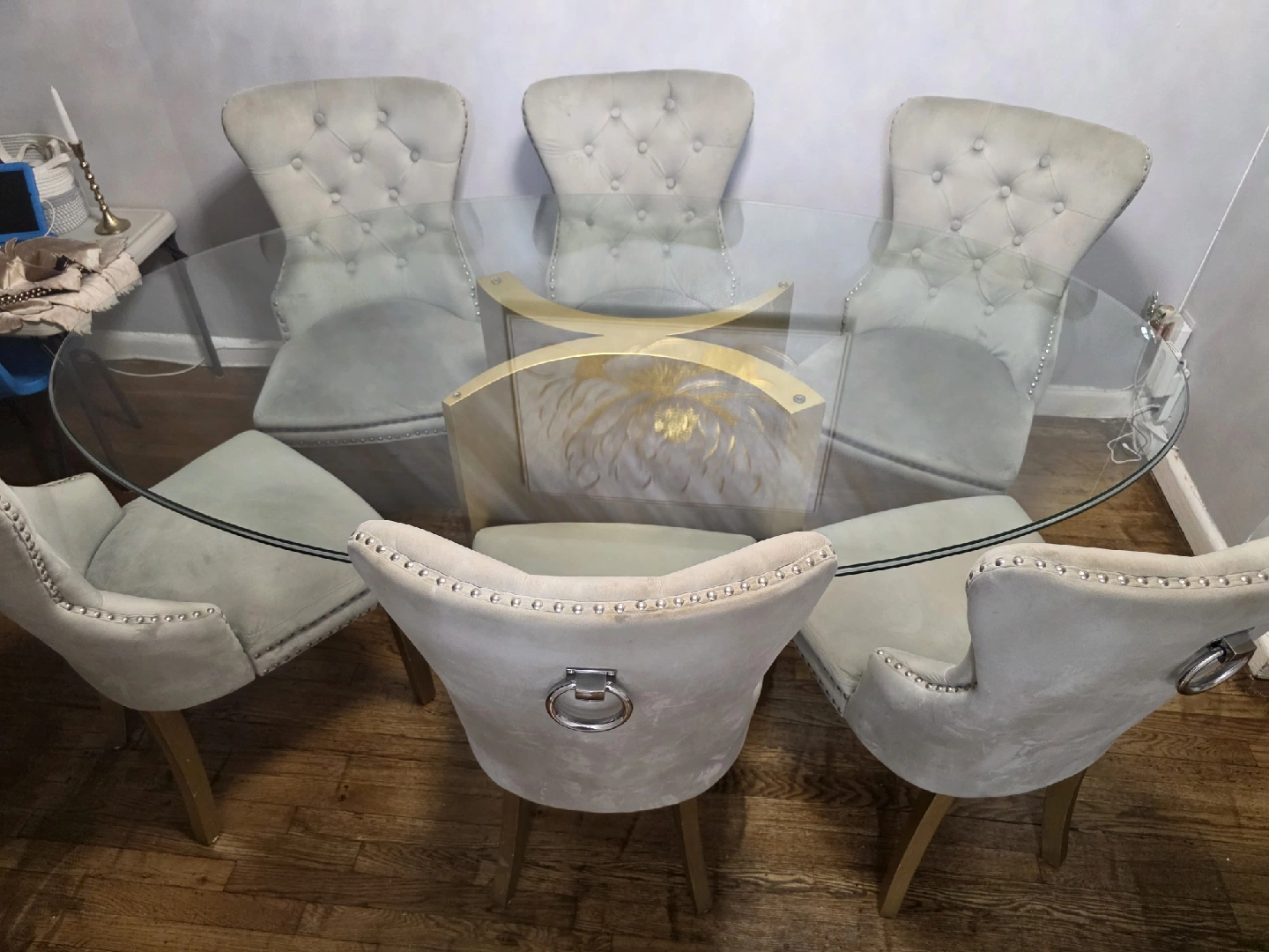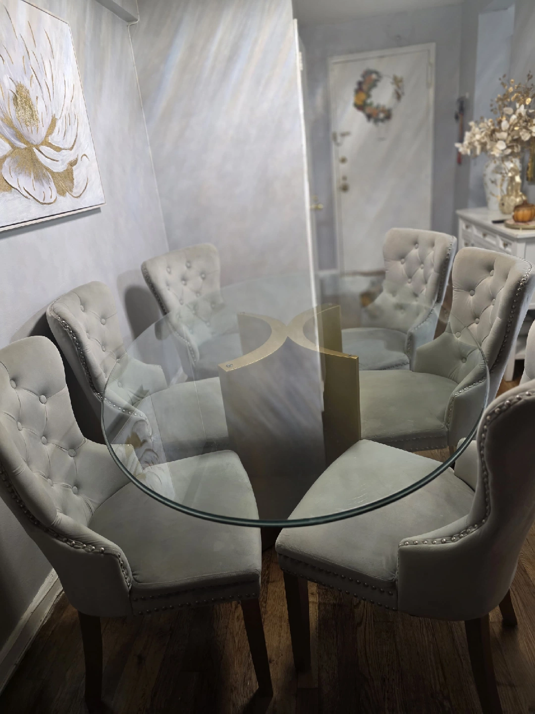 Selling a beautiful dining set that includes a glass top table and six upholstered chairs. The chairs are a light neutral color with button-tufted backs and studded trim. The table has a unique gold-colored base. Perfect for a dining room or eat-in kitchen!
