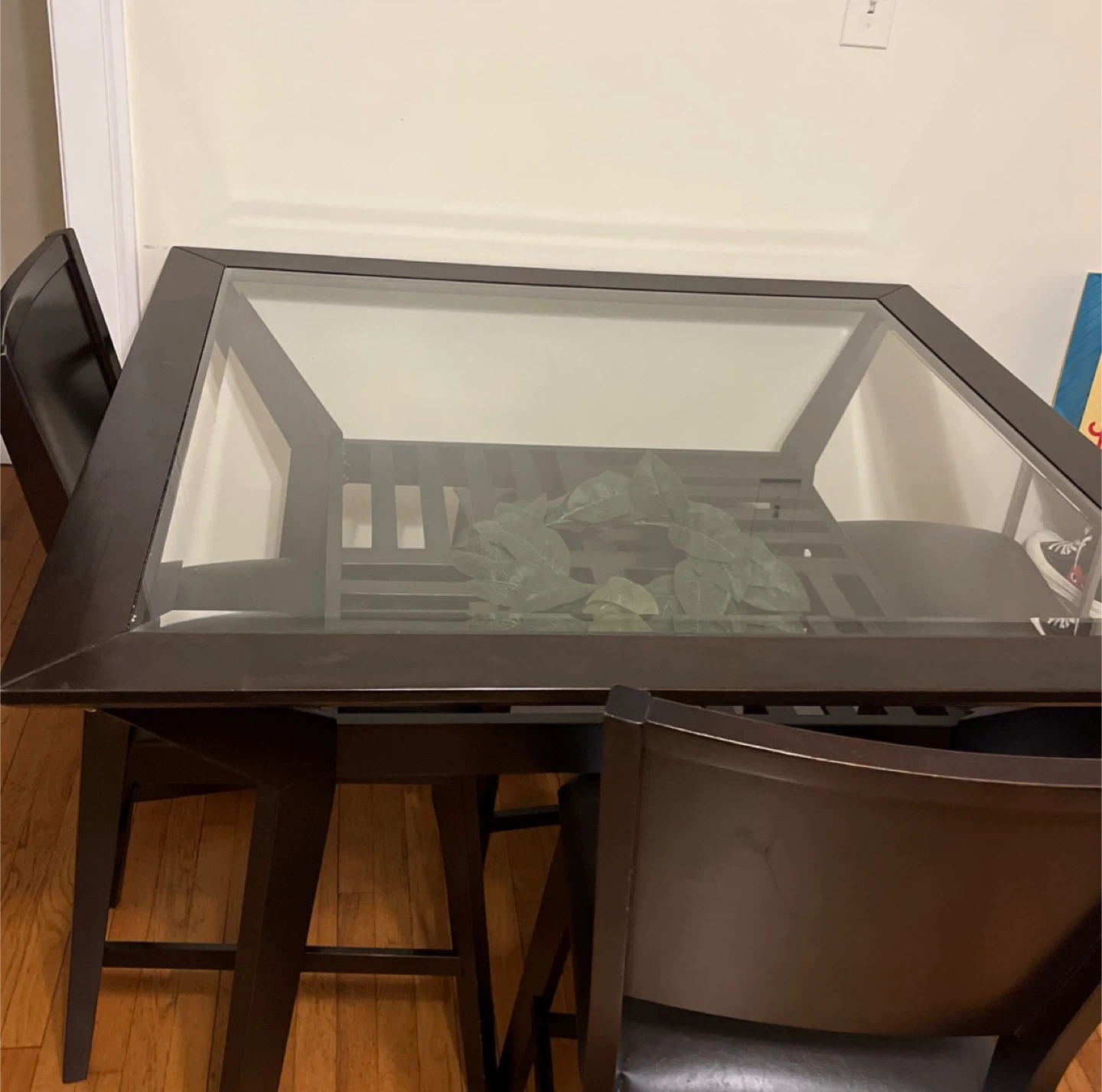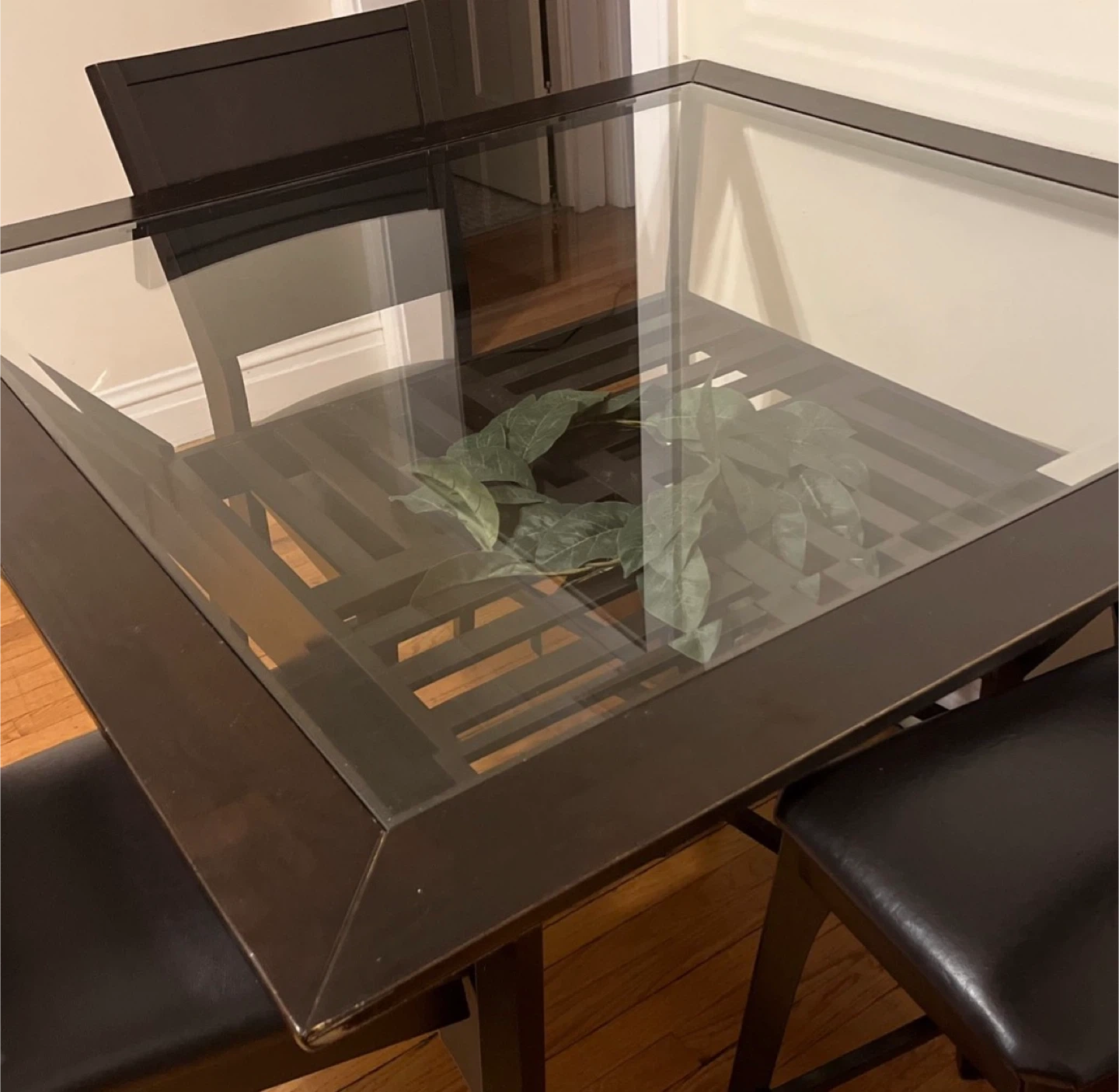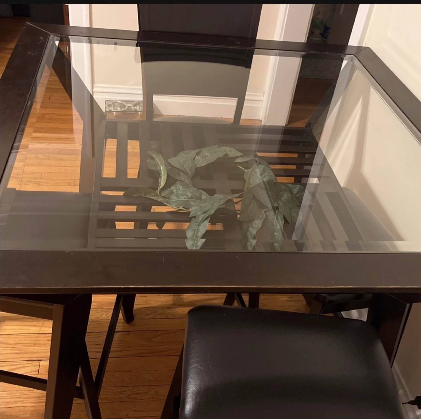 Selling a dining table set with a glass top and four chairs. The set is in good condition and would be perfect for a dining area or kitchen. The chairs have black leather seats. Wood/glass combo. Table top is about 48” X 48”, approx. 36 1/2 inches tall. Comes with 2 chairs and 2 stools.
