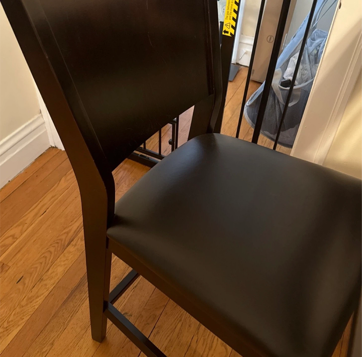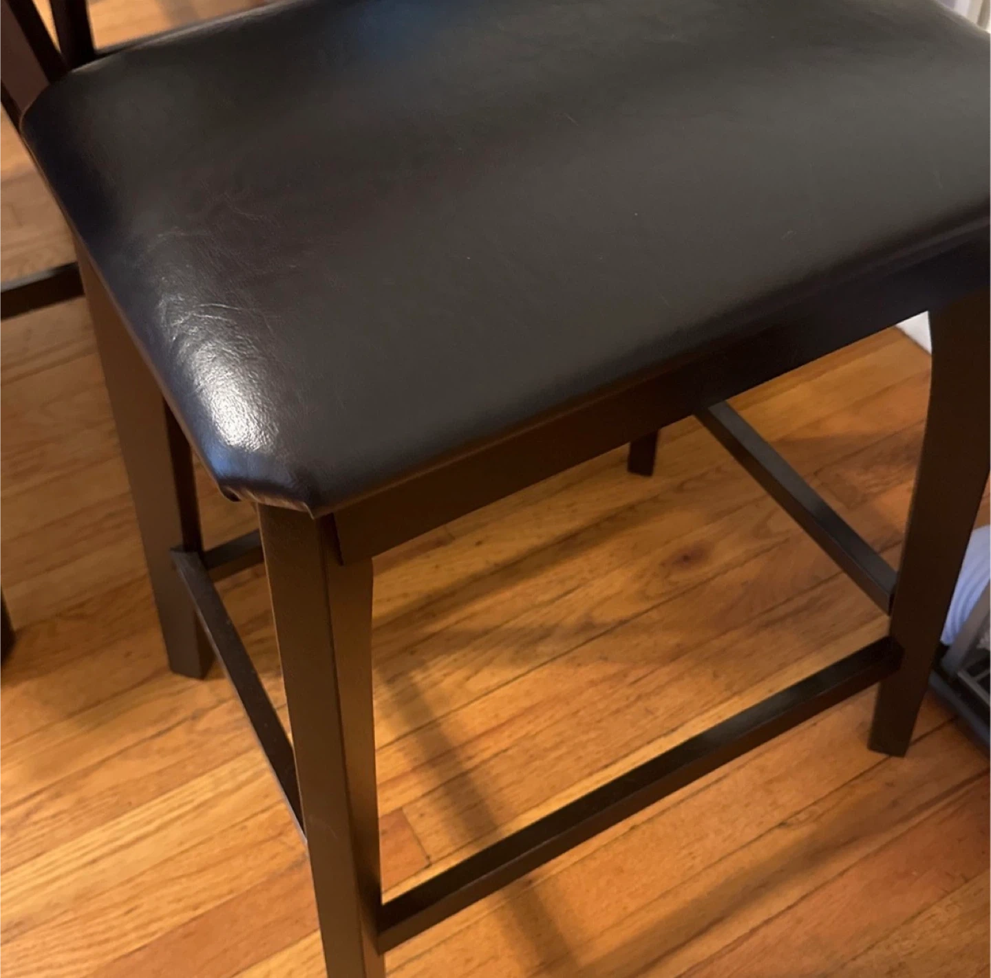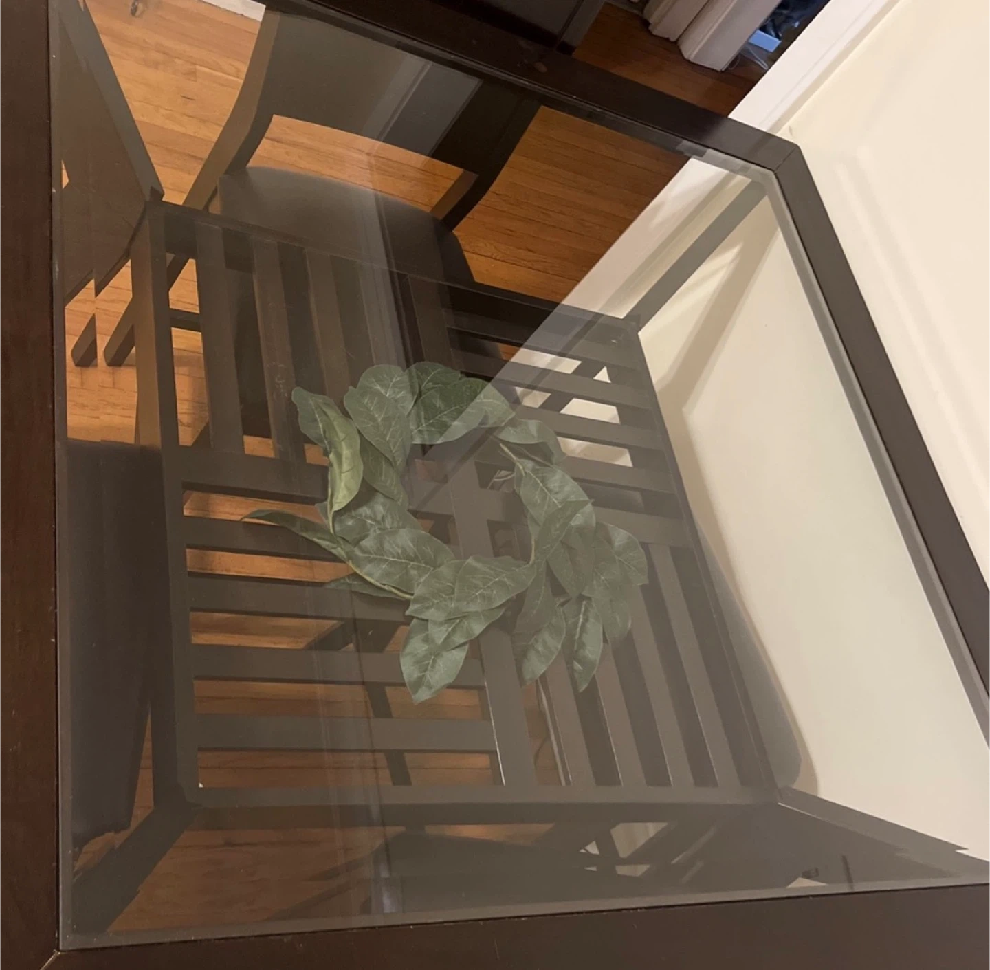 Selling a dining table set with a glass top and four chairs. The set is in good condition and would be perfect for a dining area or kitchen. The chairs have black leather seats. Wood/glass combo. Table top is about 48” X 48”, approx. 36 1/2 inches tall. Comes with 2 chairs and 2 stools.