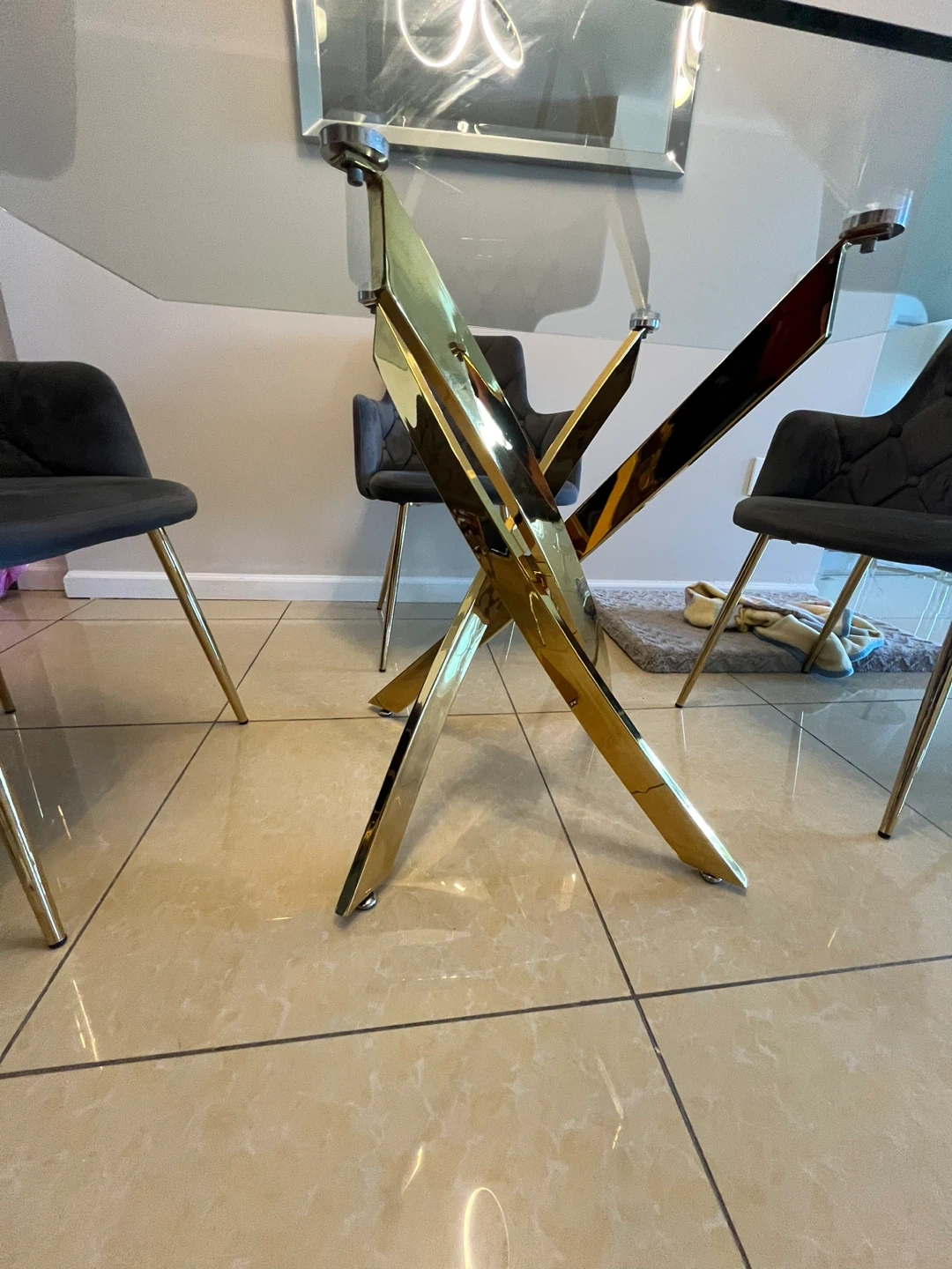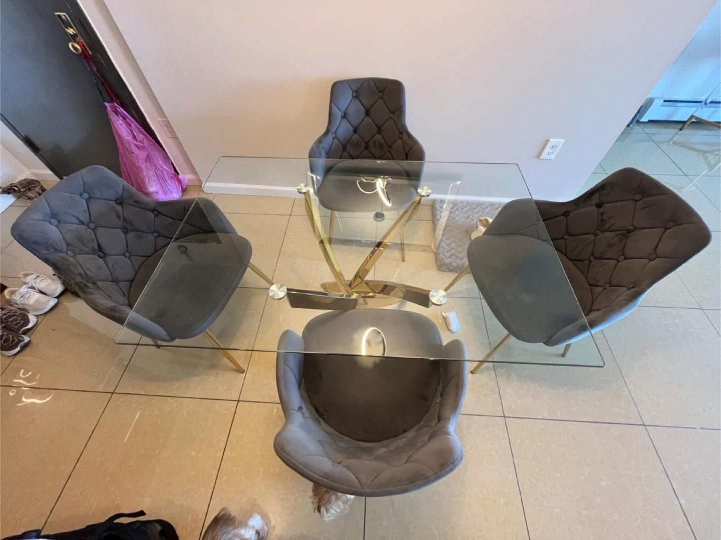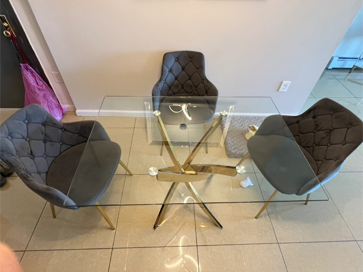 Selling a glass top dining table with unique gold legs and four comfortable gray chairs! The chairs have a stylish, tufted design. This set would be perfect for a modern dining room or kitchen space. It's in great condition and ready for a new home