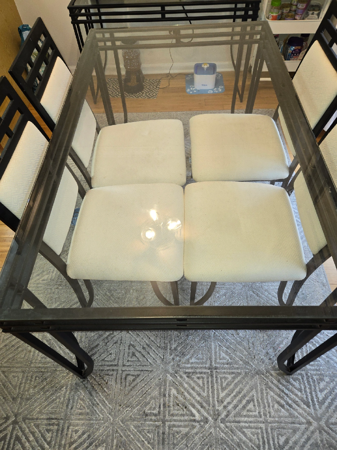 Selling a glass top dining table with a sturdy metal frame. It comes with a matching serving table. Comes with 4 chairs. 20 year old table. Normal wear and tear in the glass but still in good condition. The set is heavy and will need extra hands to move it downstairs (on the 2nd floor)