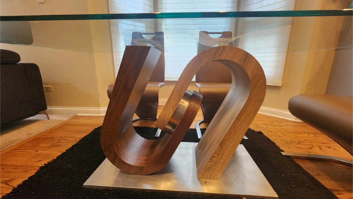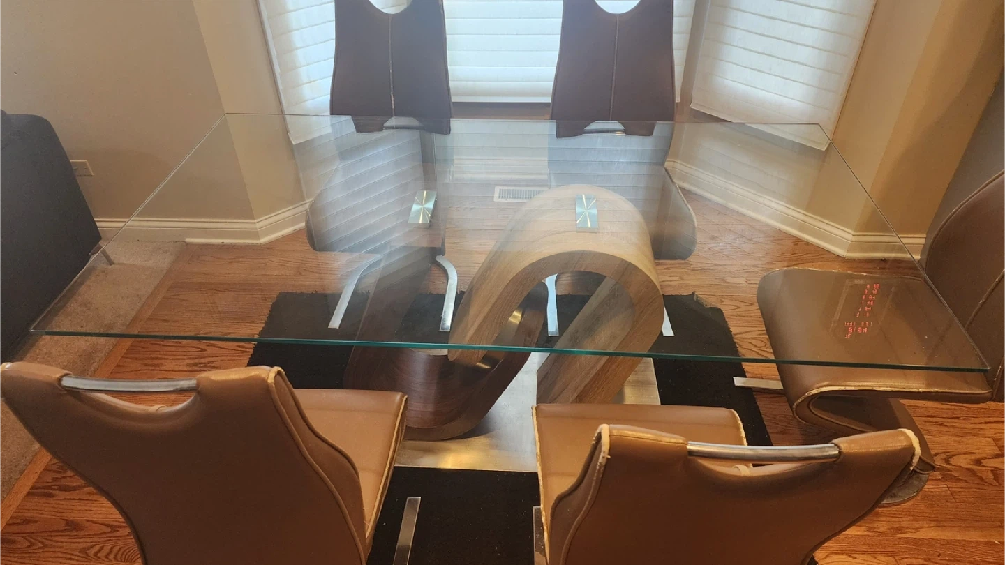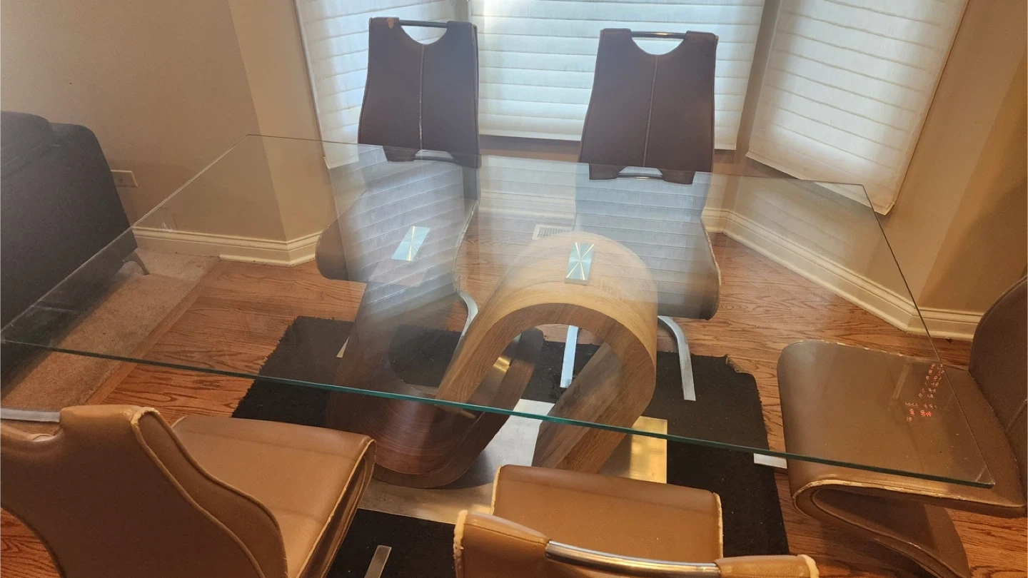 5Selling a stylish dining table featuring a clear glass top and a unique, eye-catching wood base. The base has a modern design with two different wood tones. This table would be a great addition to any dining room or kitchen space!