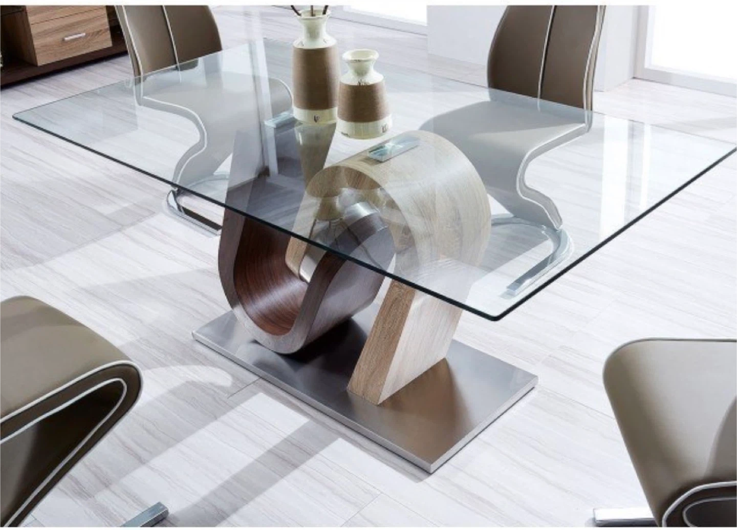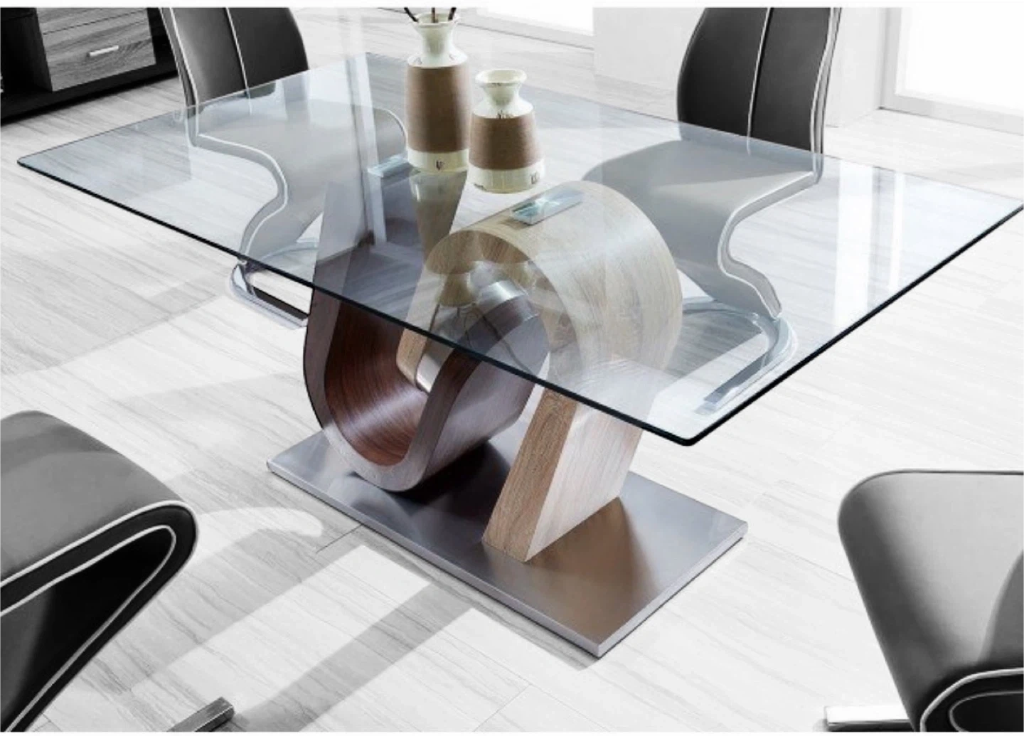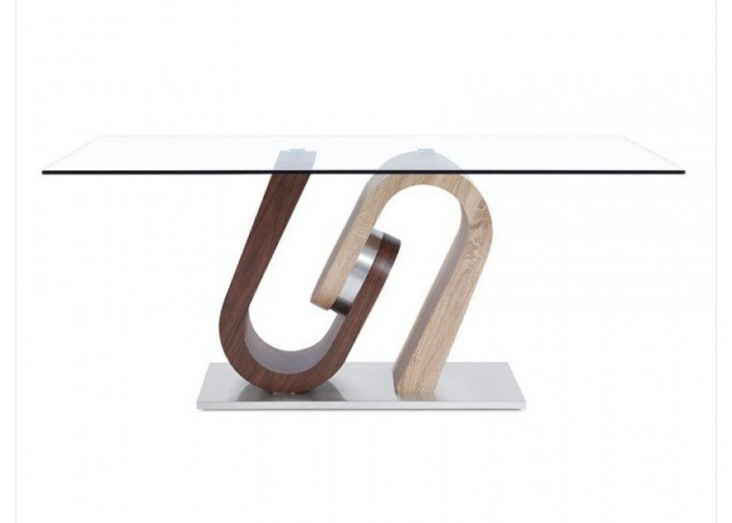 5Selling a stylish dining table featuring a clear glass top and a unique, eye-catching wood base. The base has a modern design with two different wood tones. This table would be a great addition to any dining room or kitchen space!