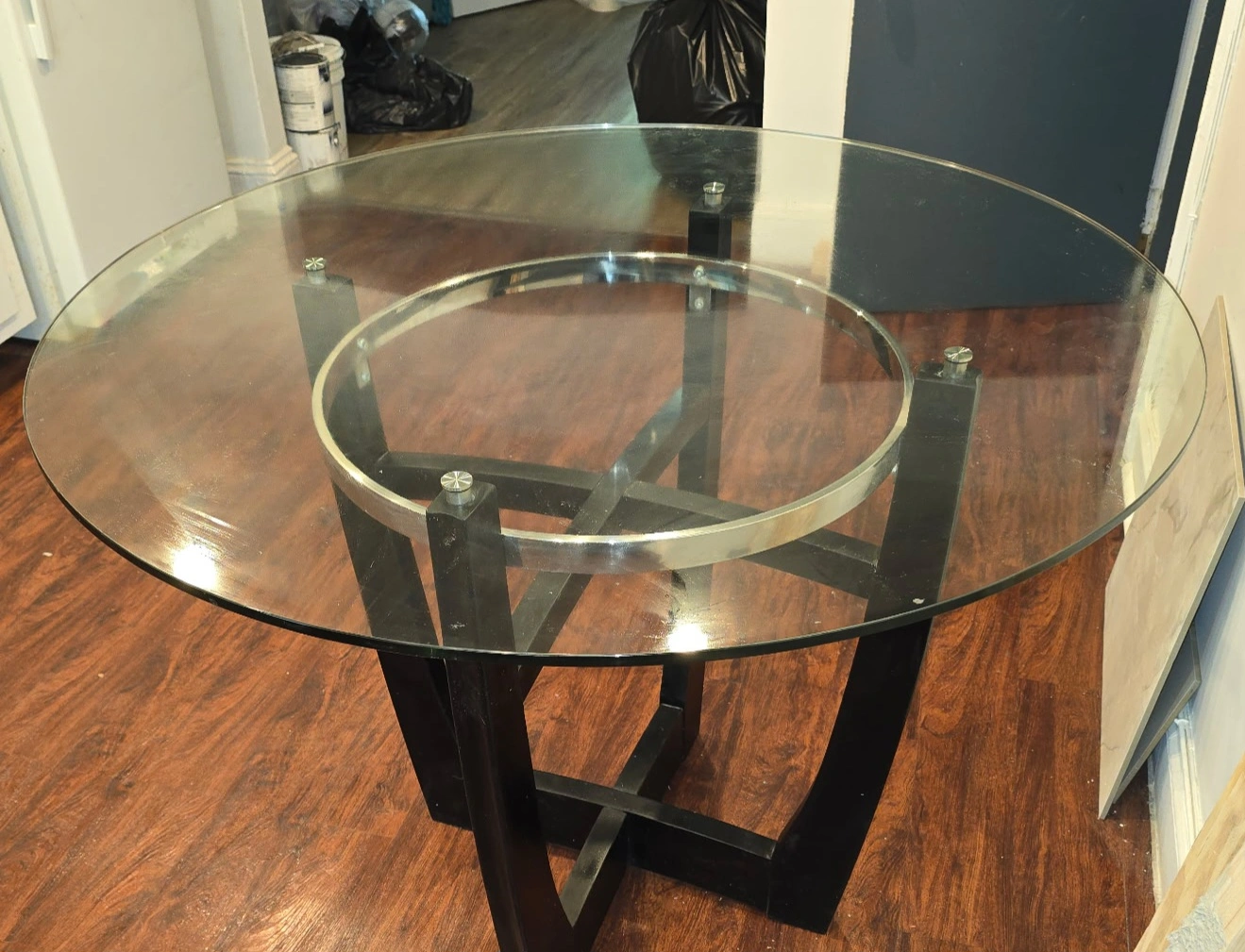 Selling a round dining table with a glass top and a black base. It's in good condition and would be a great addition to any dining room or kitchen! Chairs NOT included.
