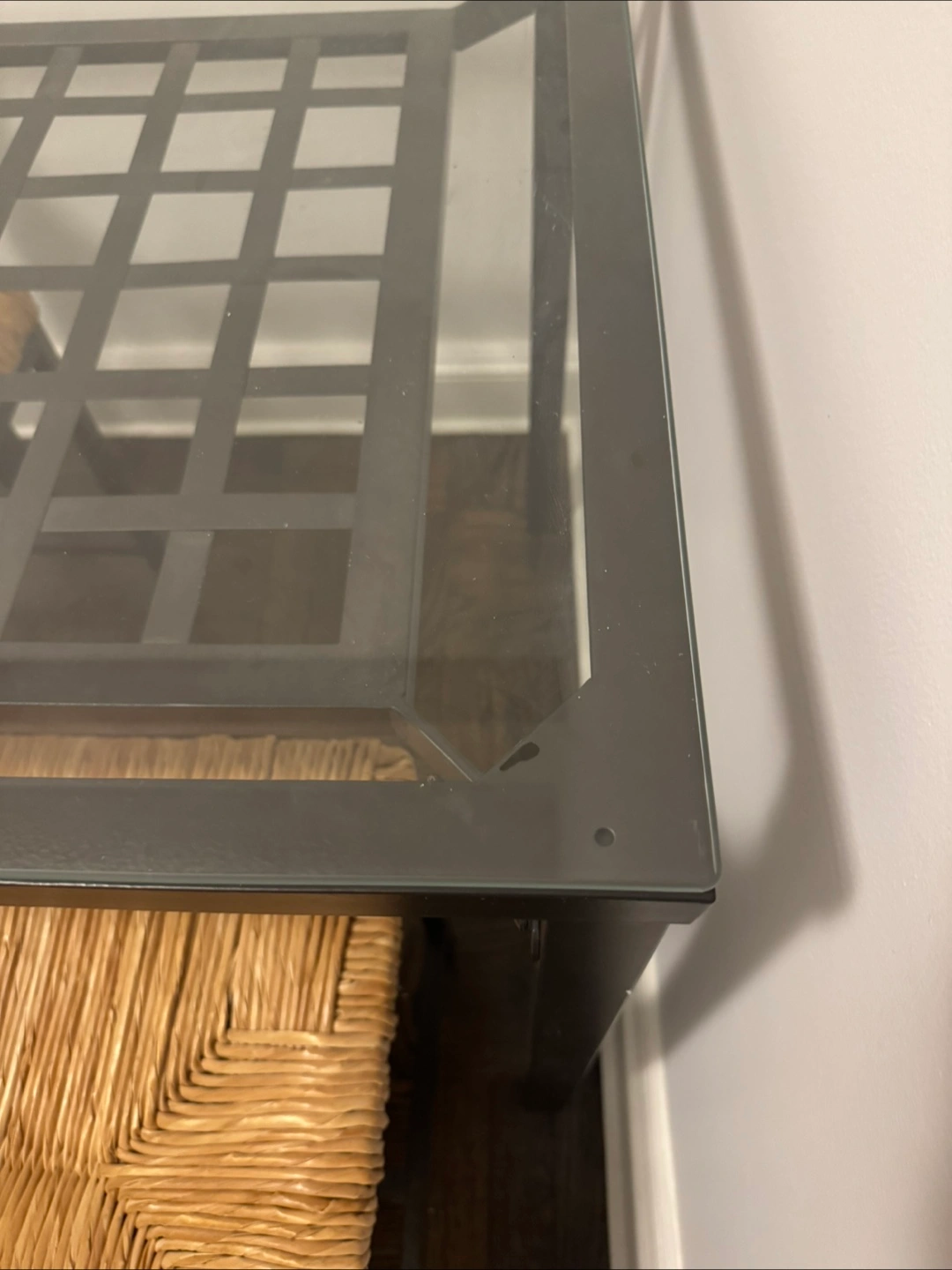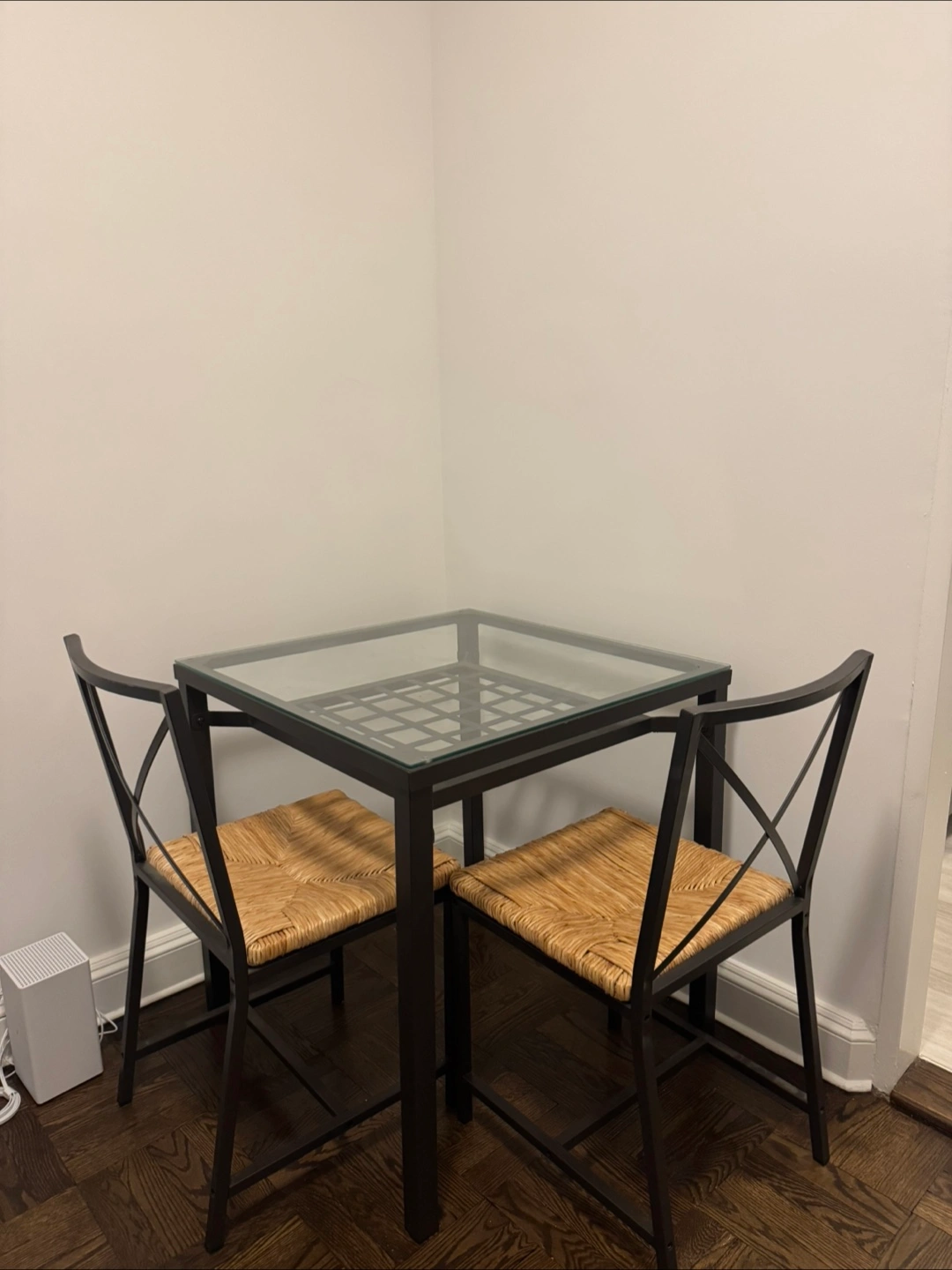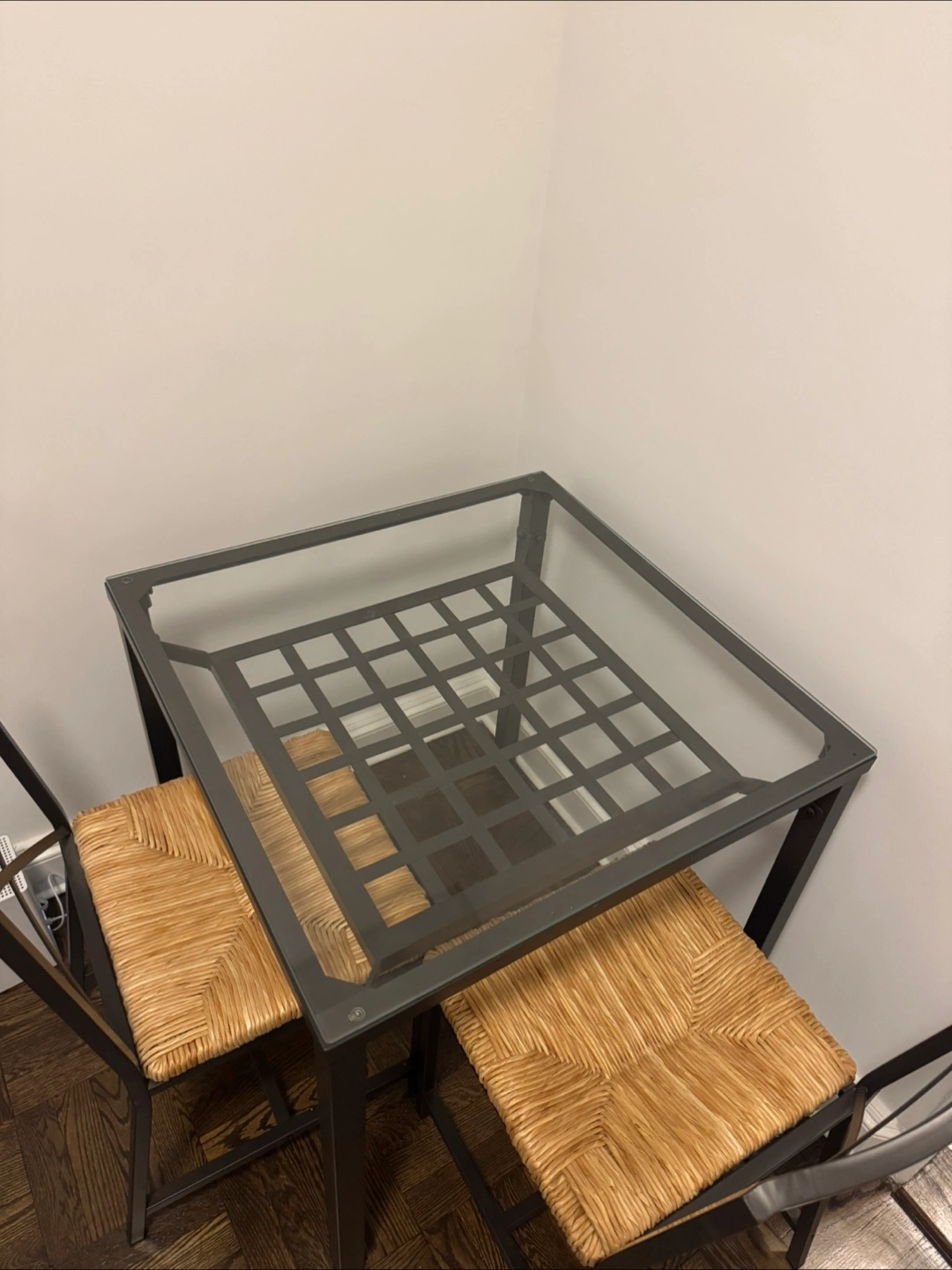 Small square glass top dining table. Metal frame. Two woven chairs included. Good for small spaces. Table measures approximately 29 inches across. No scratches. One button to secure the glass is missing (see third picture) but barely noticeable nor does it have impact on stability. The table is sturdy and in great condition. Pickup only elevator building
