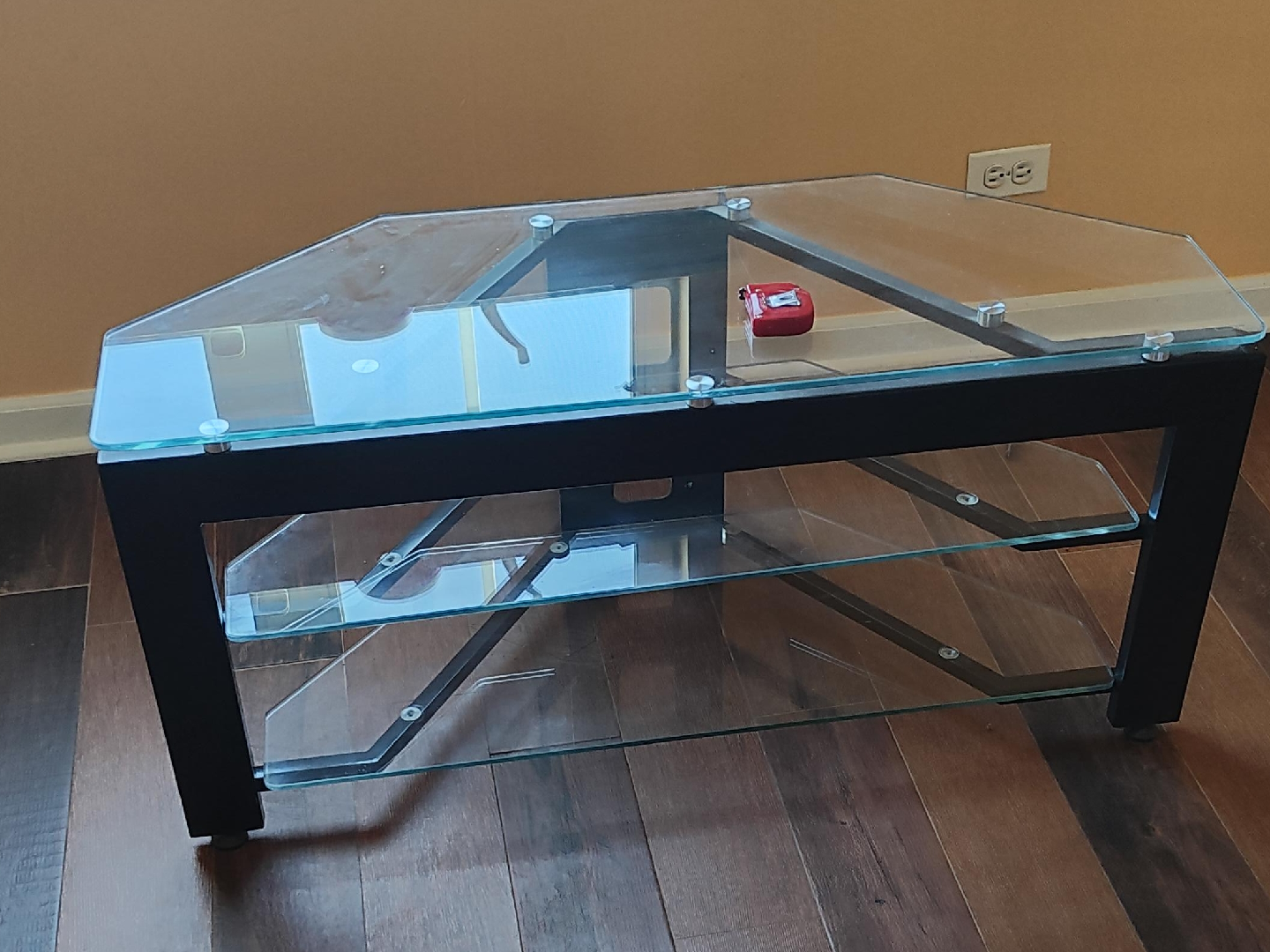 60Selling a glass TV stand with a black frame. It has a unique shape and multiple shelves for storage. It's in good condition and ready for a new home