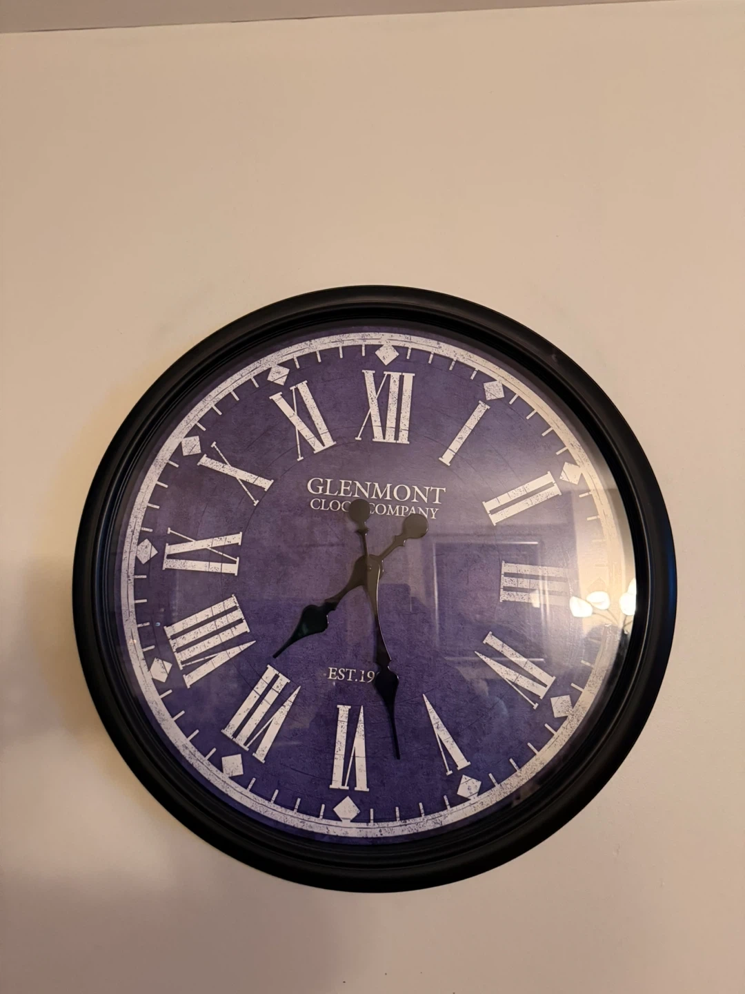 Selling a Glenmont Clock Company wall clock. It features a black frame and a purple face with Roman numerals. It would look great in any room!