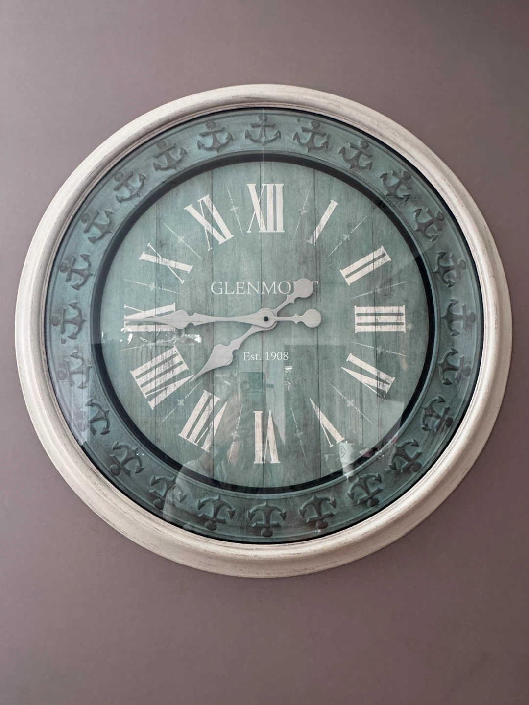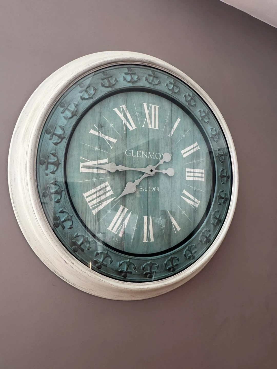 65Selling a Glenmore wall clock with a nautical design. It features Roman numerals and anchor details around the rim. Perfect for adding a coastal touch to your home!