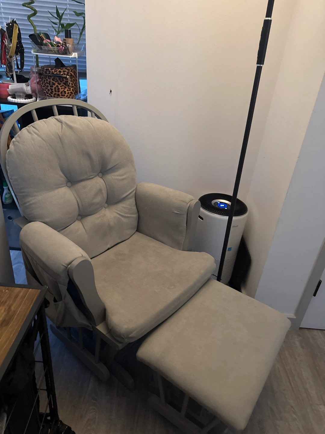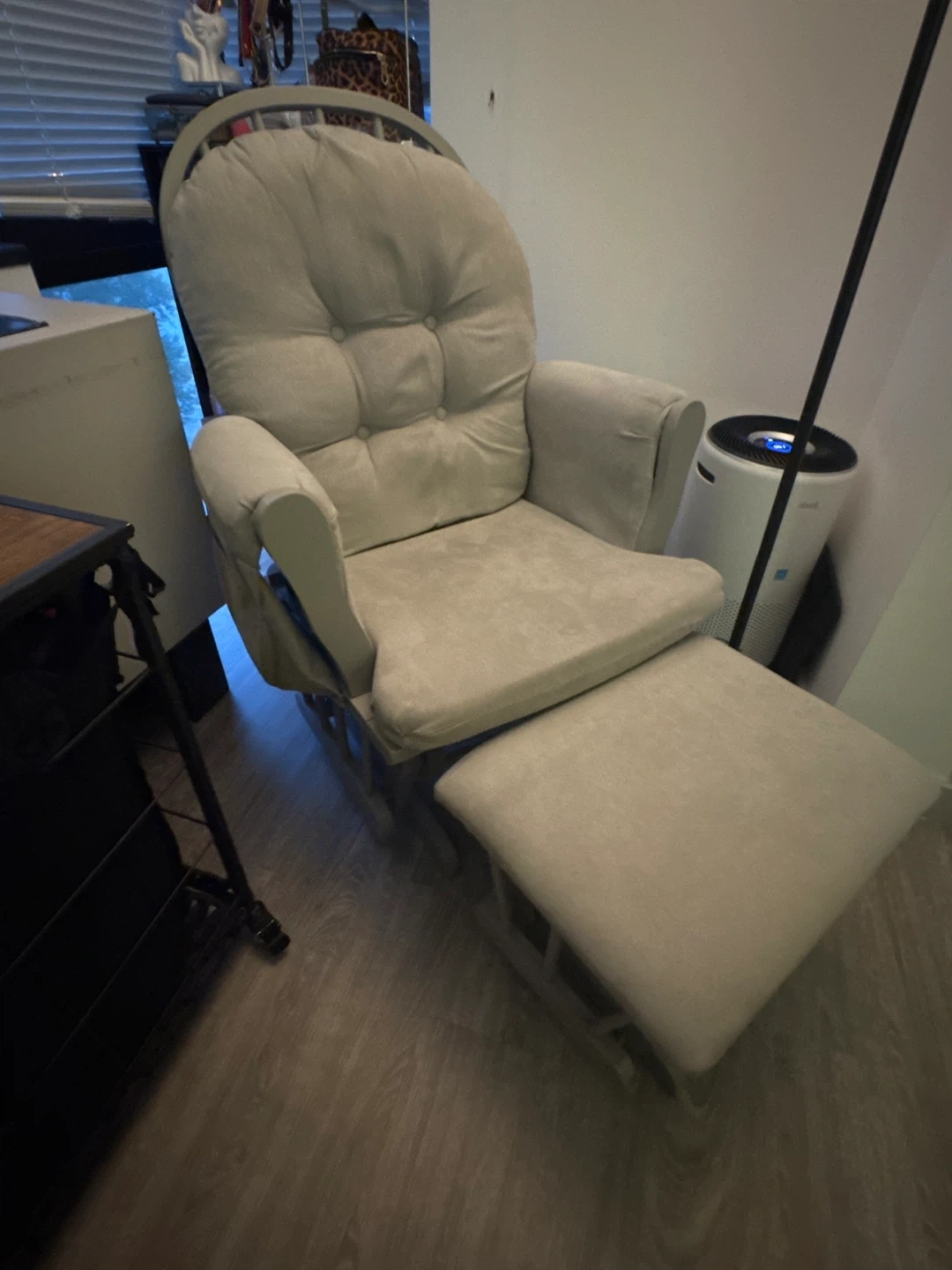Selling a comfortable glider rocking chair with a matching ottoman. It's in great condition and perfect for a nursery or any room where you want a relaxing spot. The chair has a smooth gliding motion, and the ottoman provides extra comfort for your feet. It's a great set to unwind and relax in!