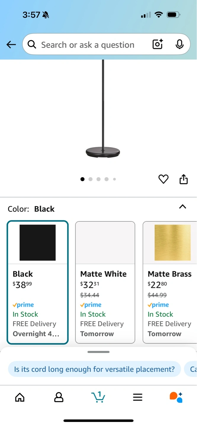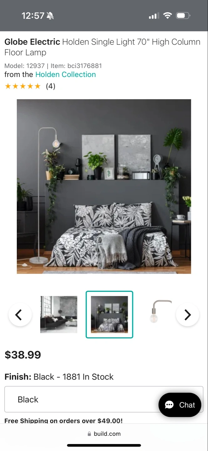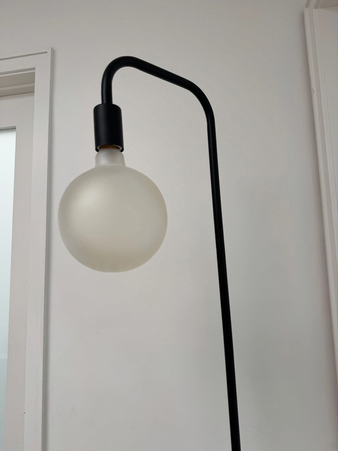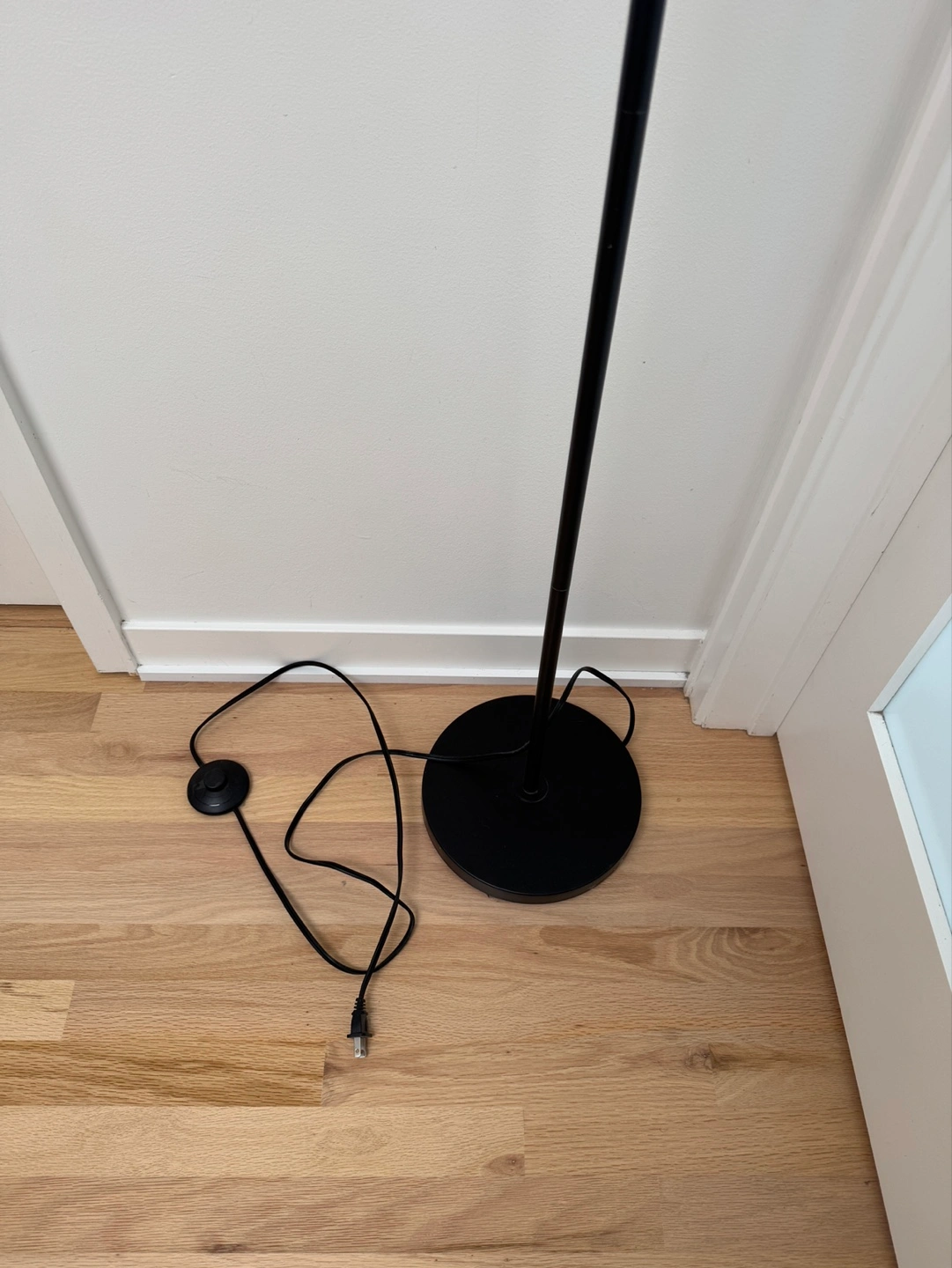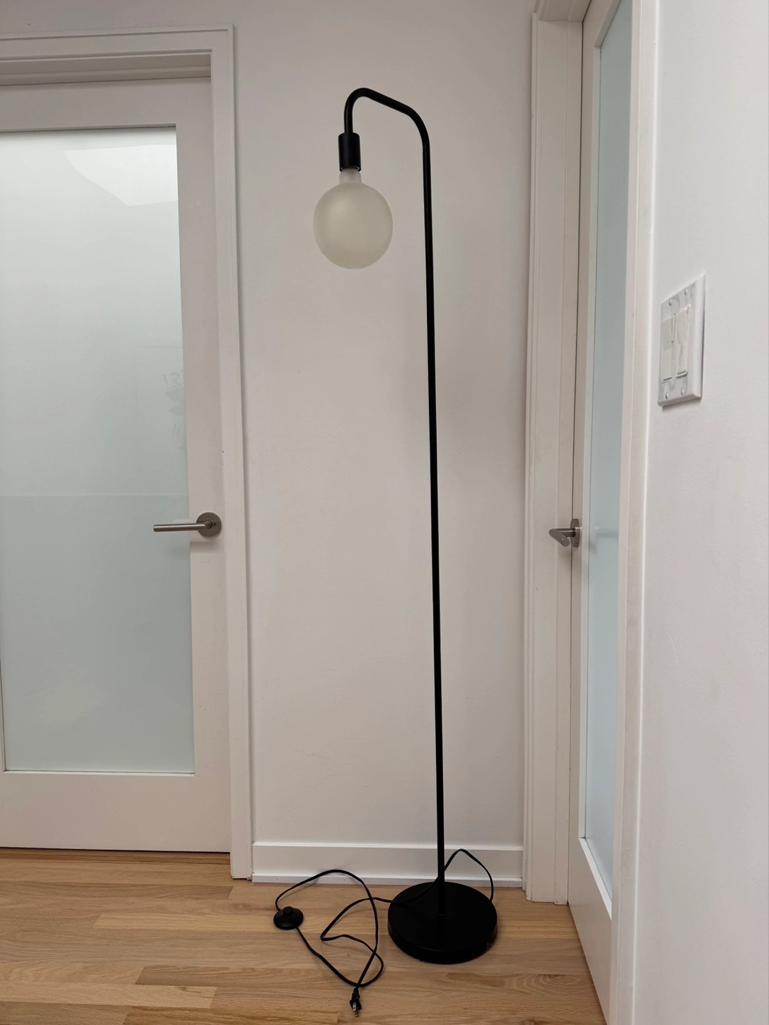 63Black floor lamp, 70 inches tall. Simple design, single frosted glass globe. Foot switch. Pick up in Lincoln Park, Mohawk and Armitage