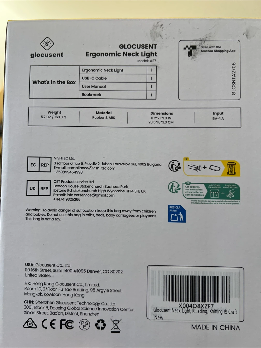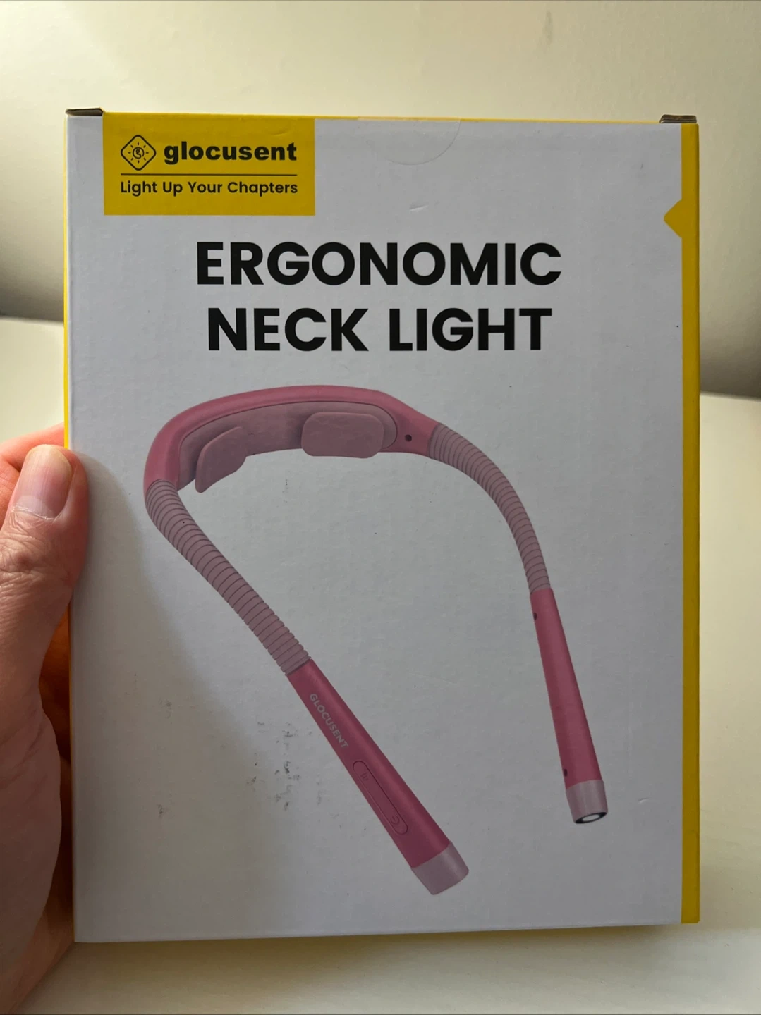 33Selling a new Glocusent Ergonomic Neck Light! It's in pink and comes with the original box. Included in the box is a USB-C cable, user manual, and bookmark. Dimensions: 11.2" * 7.1" * 1.3 in (28.5 * 18 * 3.3 cm) Weight: 5.7 oz / 163.0 g Material: Rubber & ABS