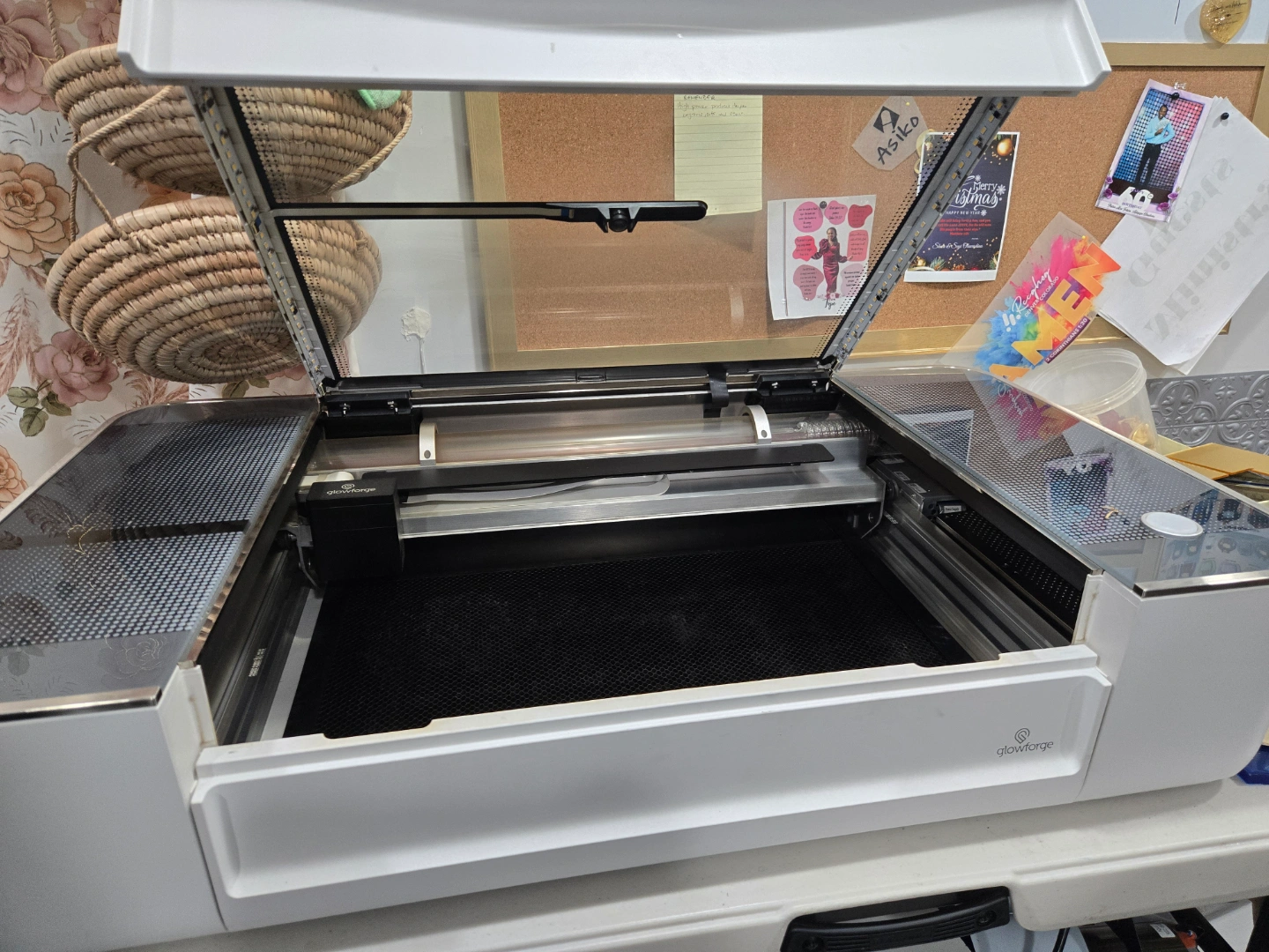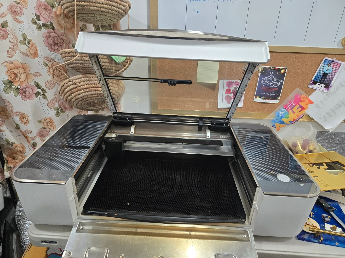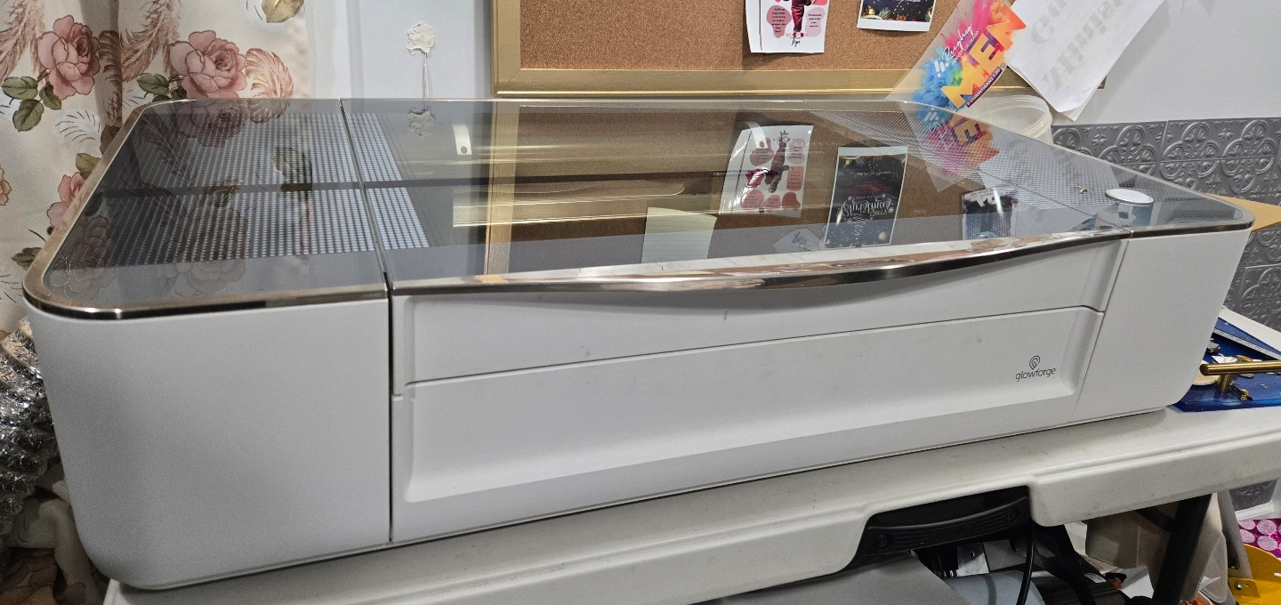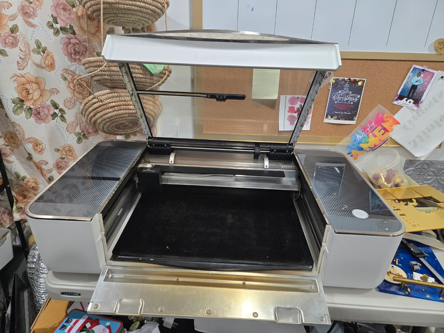 Laser cutter, good condition. White and silver. Glass top. Ready to use. original box still available