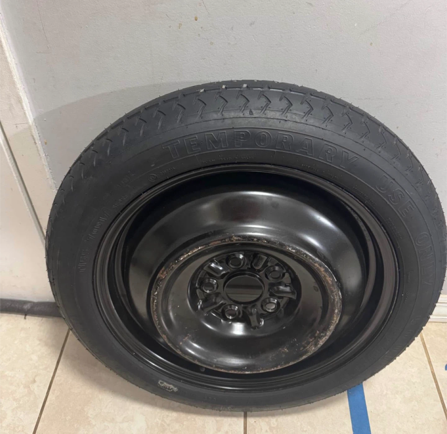 This is a temporary spare tire for your vehicle. It's designed for emergency use only. The tire is black and made of rubber. It's a compact size, perfect for stowing away in your trunk.