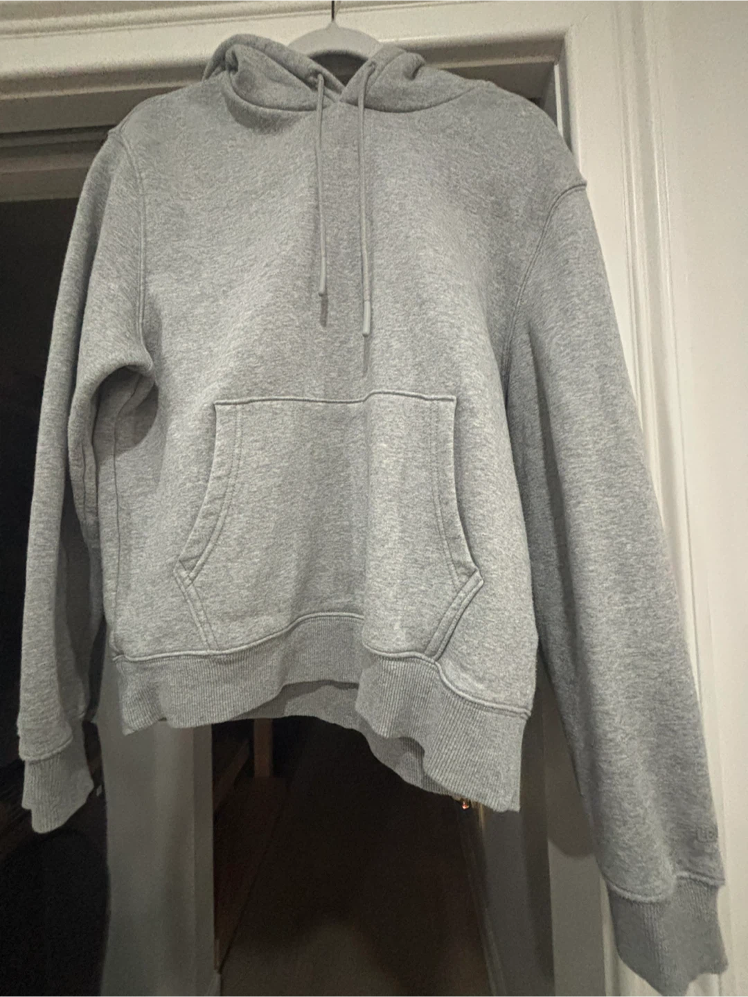 Gray cropped hoodie made of a soft cotton blend. It features a drawstring hood and a front kangaroo pocket. LCKR is a Foot Locker brand.