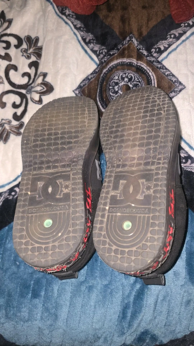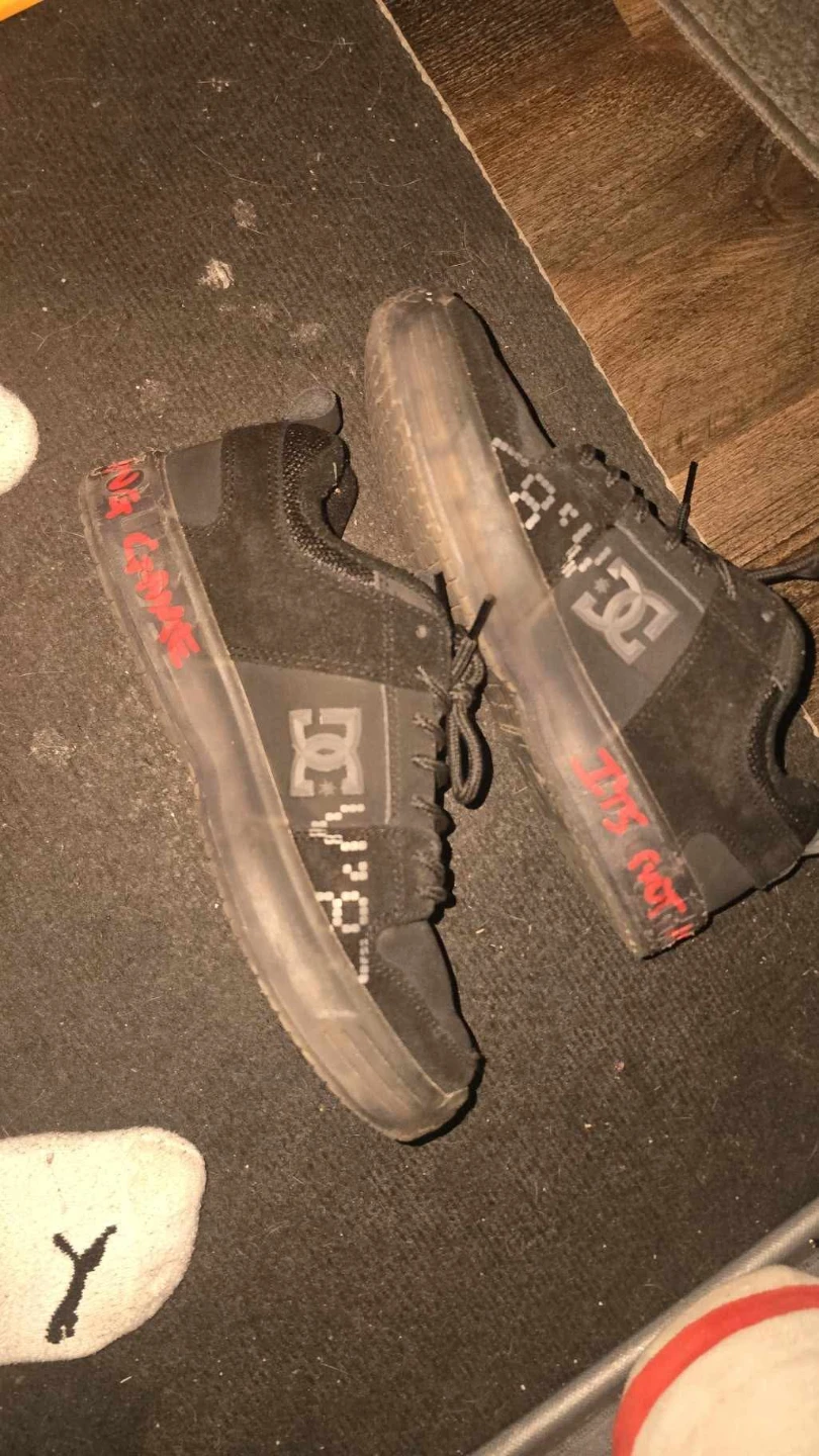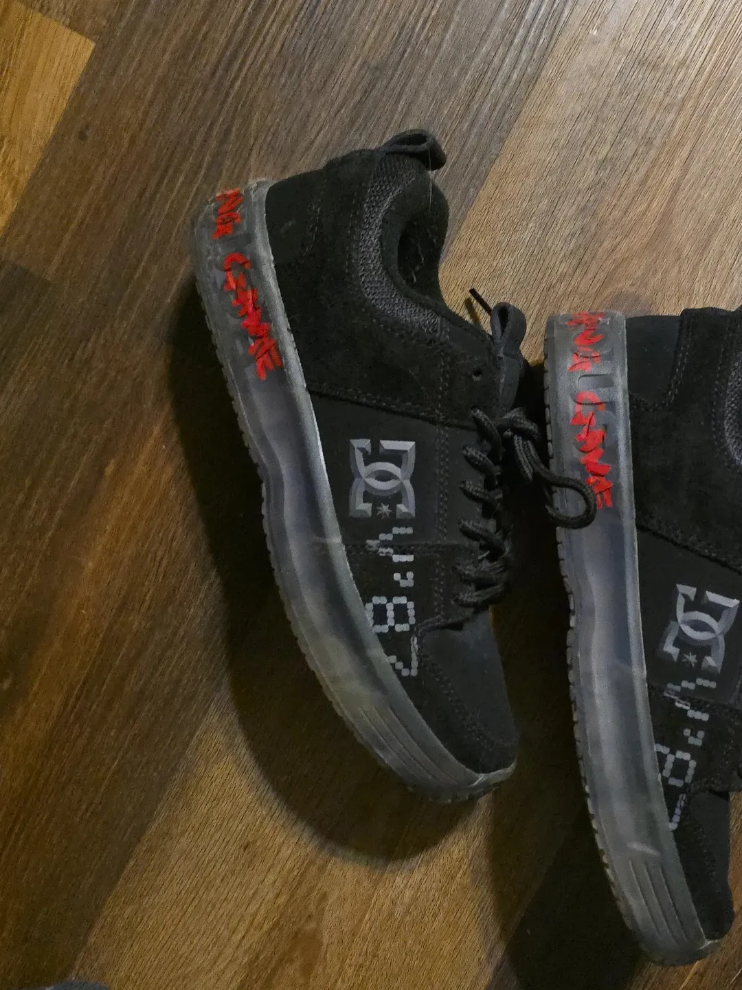 Black suede DC shoes. They feature the DC logo on the side. The soles are transparent with red writing on the side.