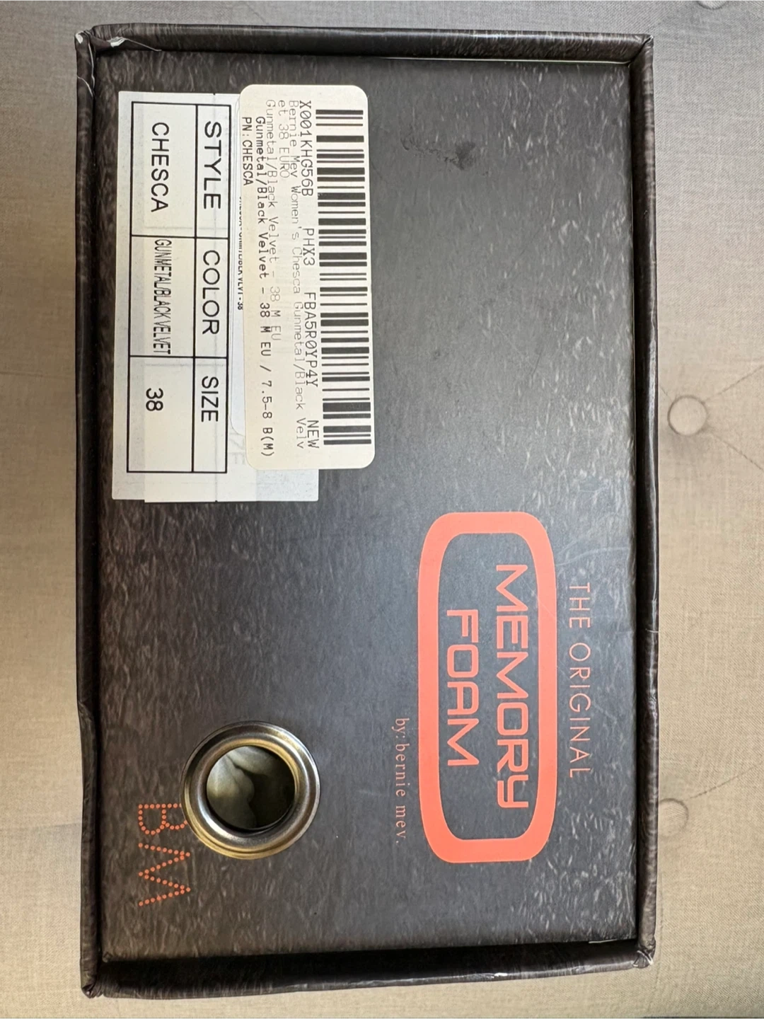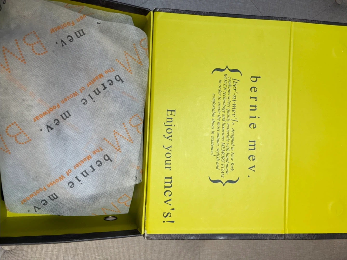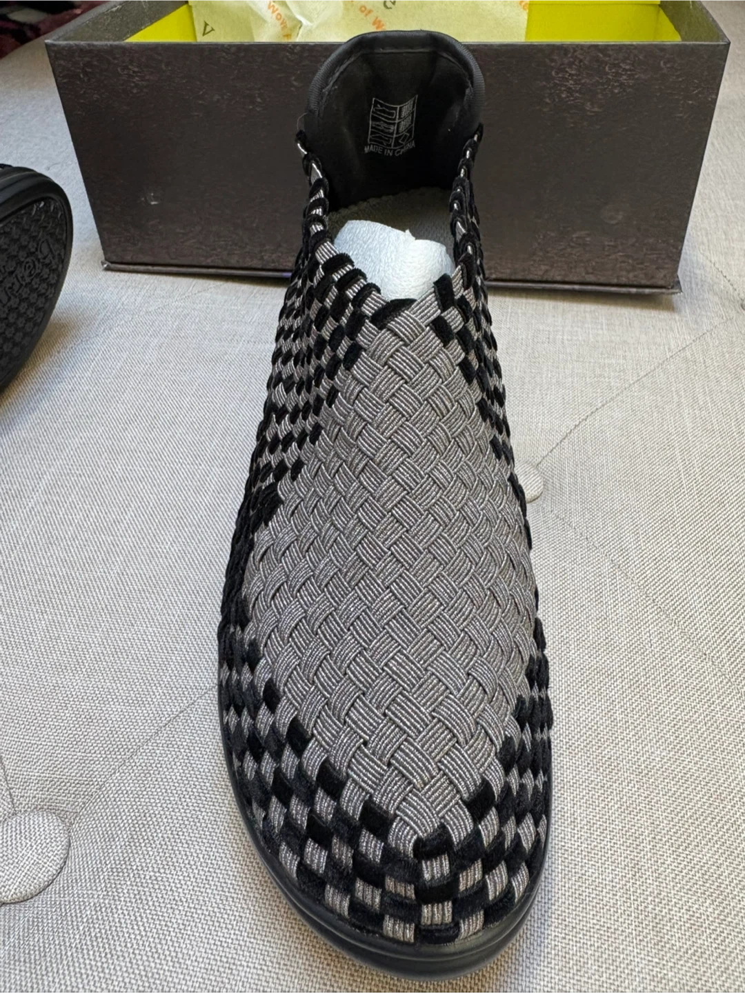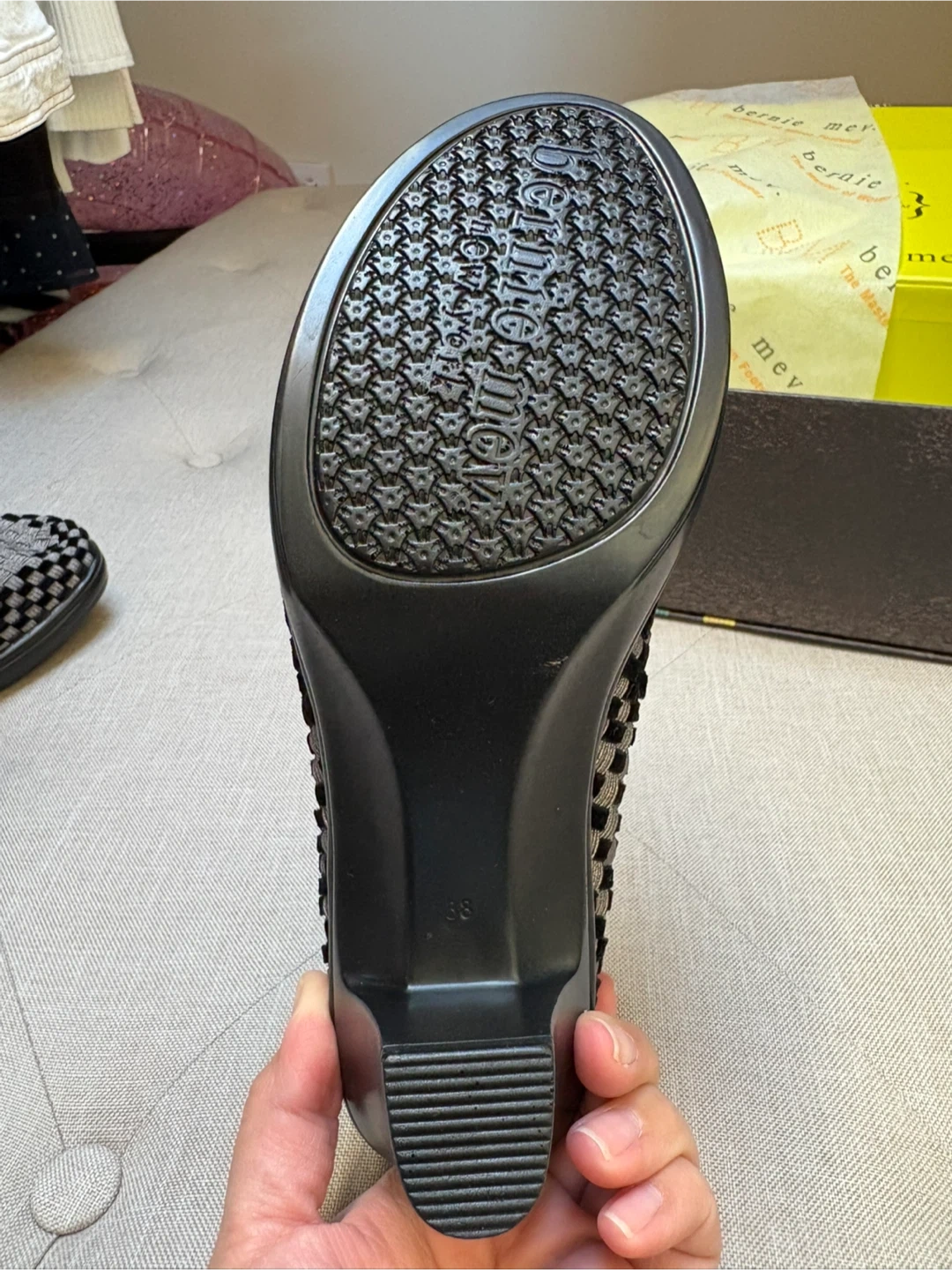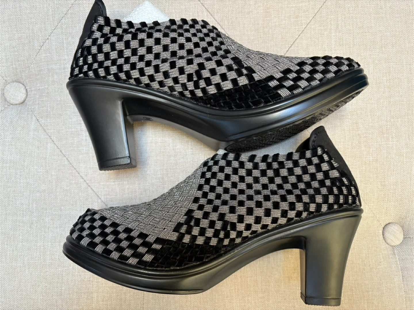 Bernie Mev woven slip-on heel shoes. Features a comfortable, flexible woven upper with a low heel. Includes original box. Never Worn. Memory Foam inside. Gunmetal silver color with black velvet. Size 38 Women’s.