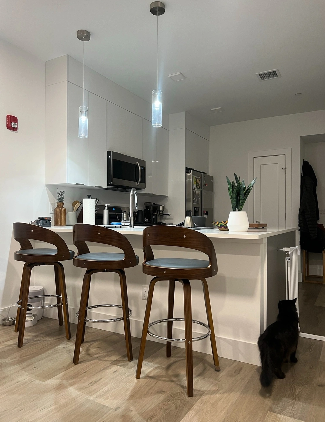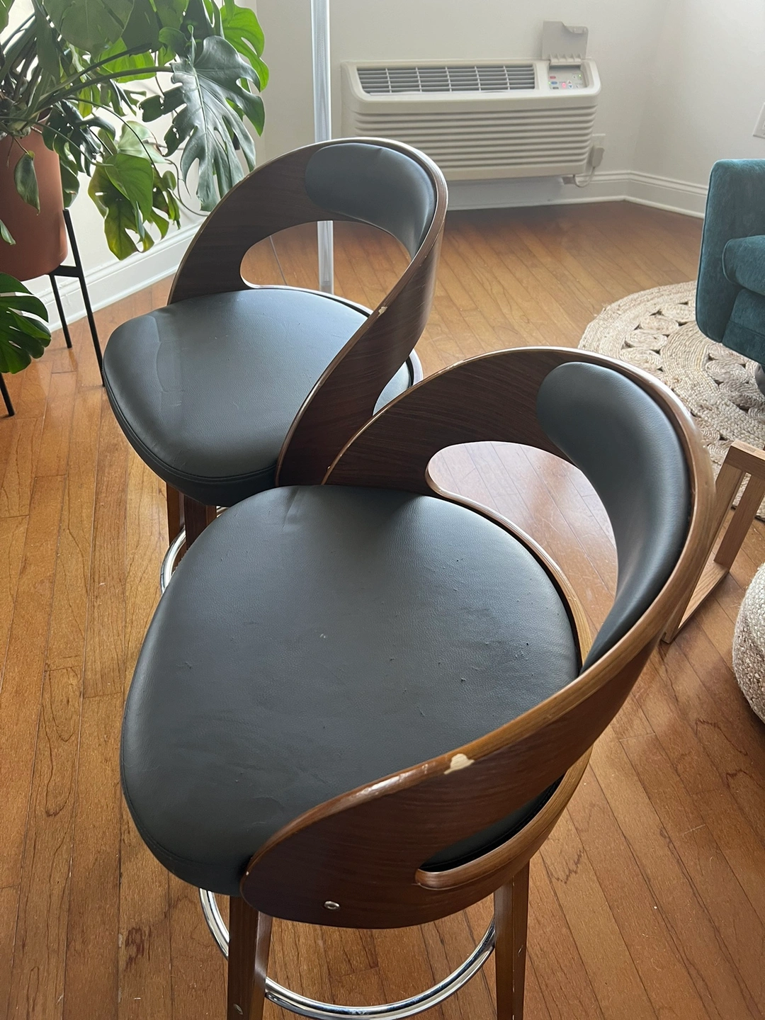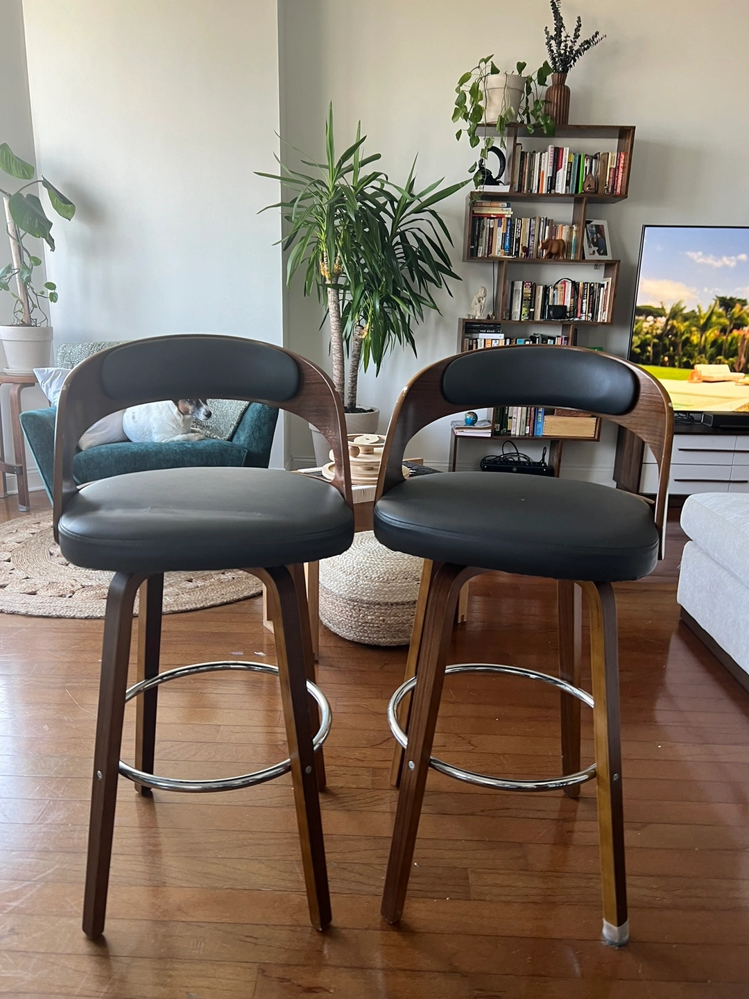 Set of two Wayfair swivel bar stools with a wood frame and grey leather seats. Slightly scratched but very sturdy and perfect for a tall bar/island. Third stool available for additional $20 (purchased as singles, prior island fit just 3). Trying my luck selling as pair first as it seems to be the move here :)