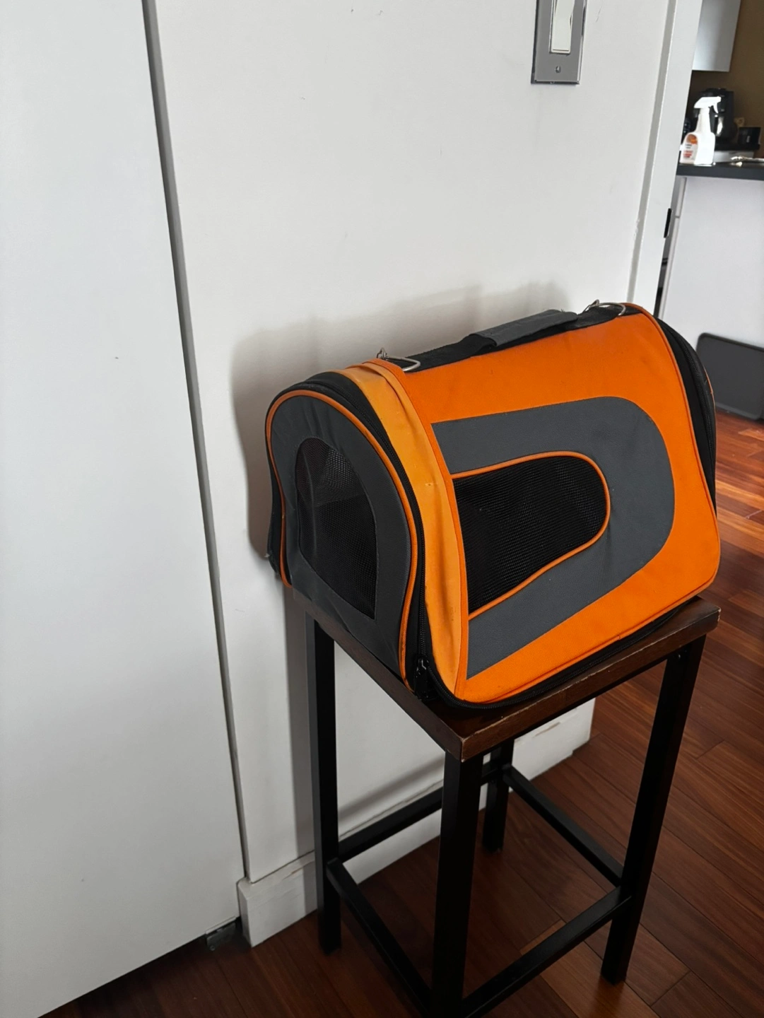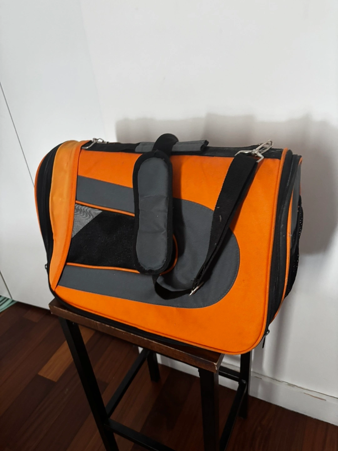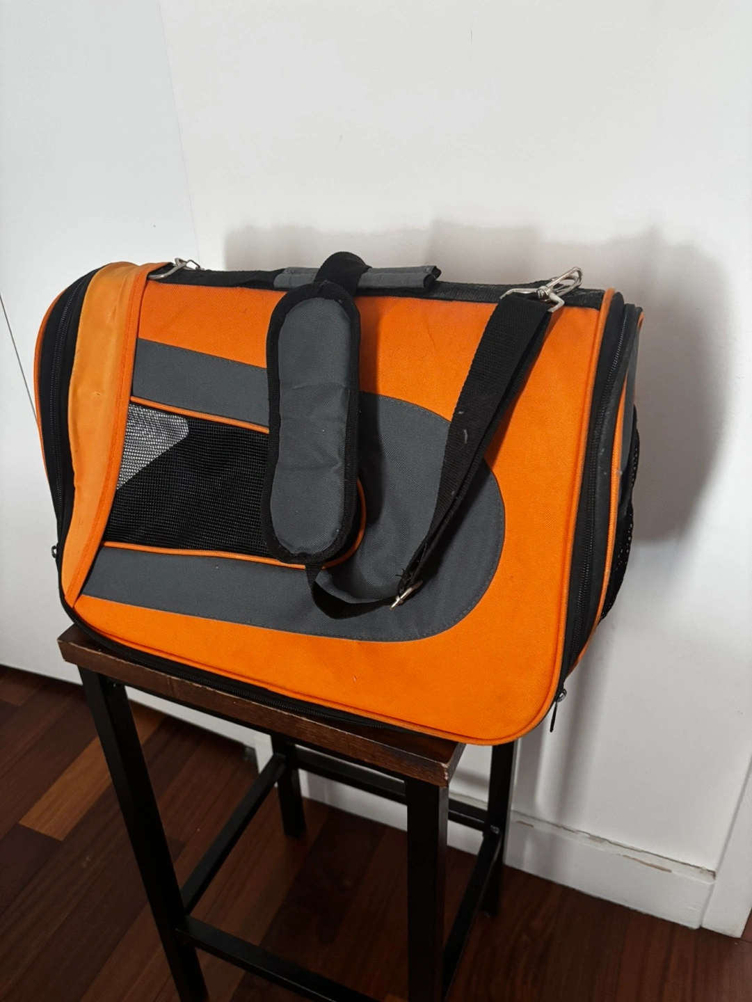 Soft-sided pet carrier. Orange and gray. Shoulder strap. Mesh ventilation. Used twice . Folds down flat .