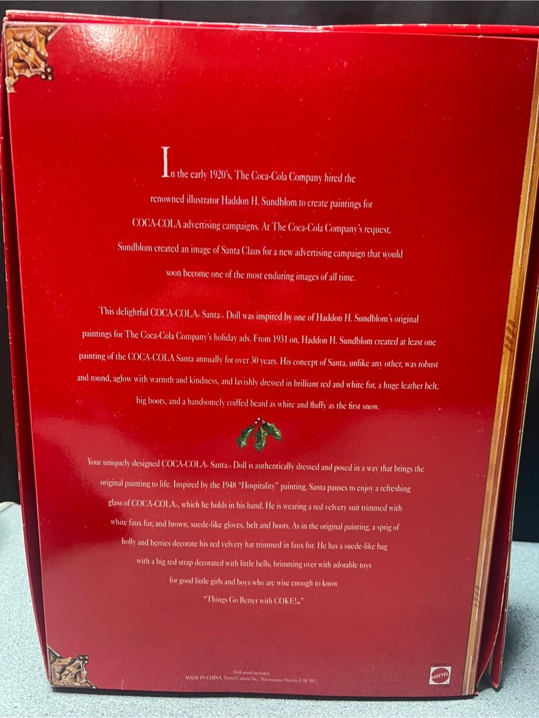 Coca-Cola Santa doll inspired by Haddon H. Sundblom's original paintings for The Coca-Cola Company's holiday ads. This doll is dressed in a red velvety suit trimmed with white faux fur. It includes a suede-like bag with a big red strap decorated with holly and berries. Comes in the original box