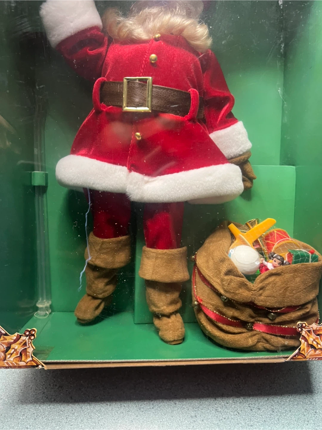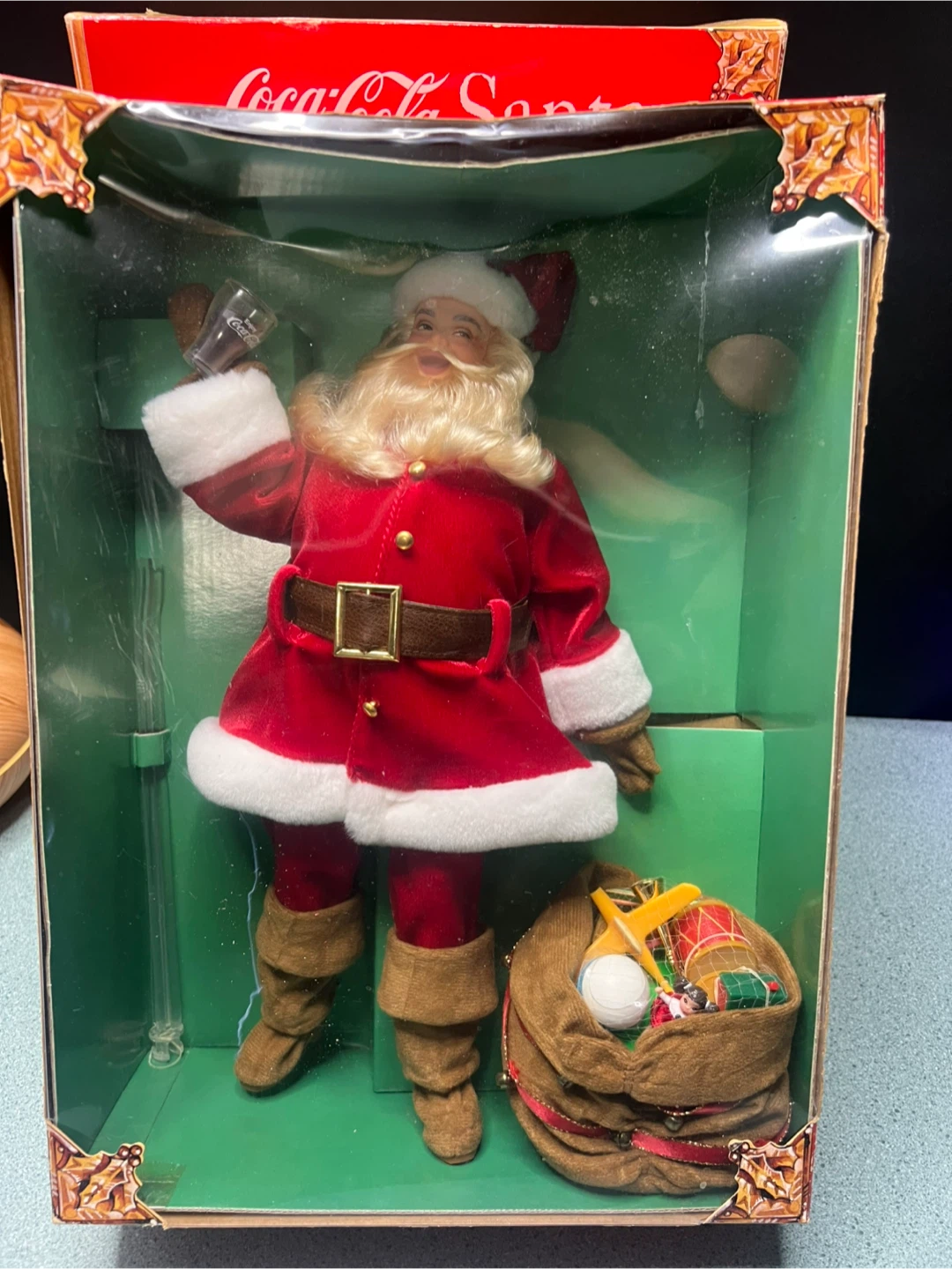 Coca-Cola Santa doll inspired by Haddon H. Sundblom's original paintings for The Coca-Cola Company's holiday ads. This doll is dressed in a red velvety suit trimmed with white faux fur. It includes a suede-like bag with a big red strap decorated with holly and berries. Comes in the original box