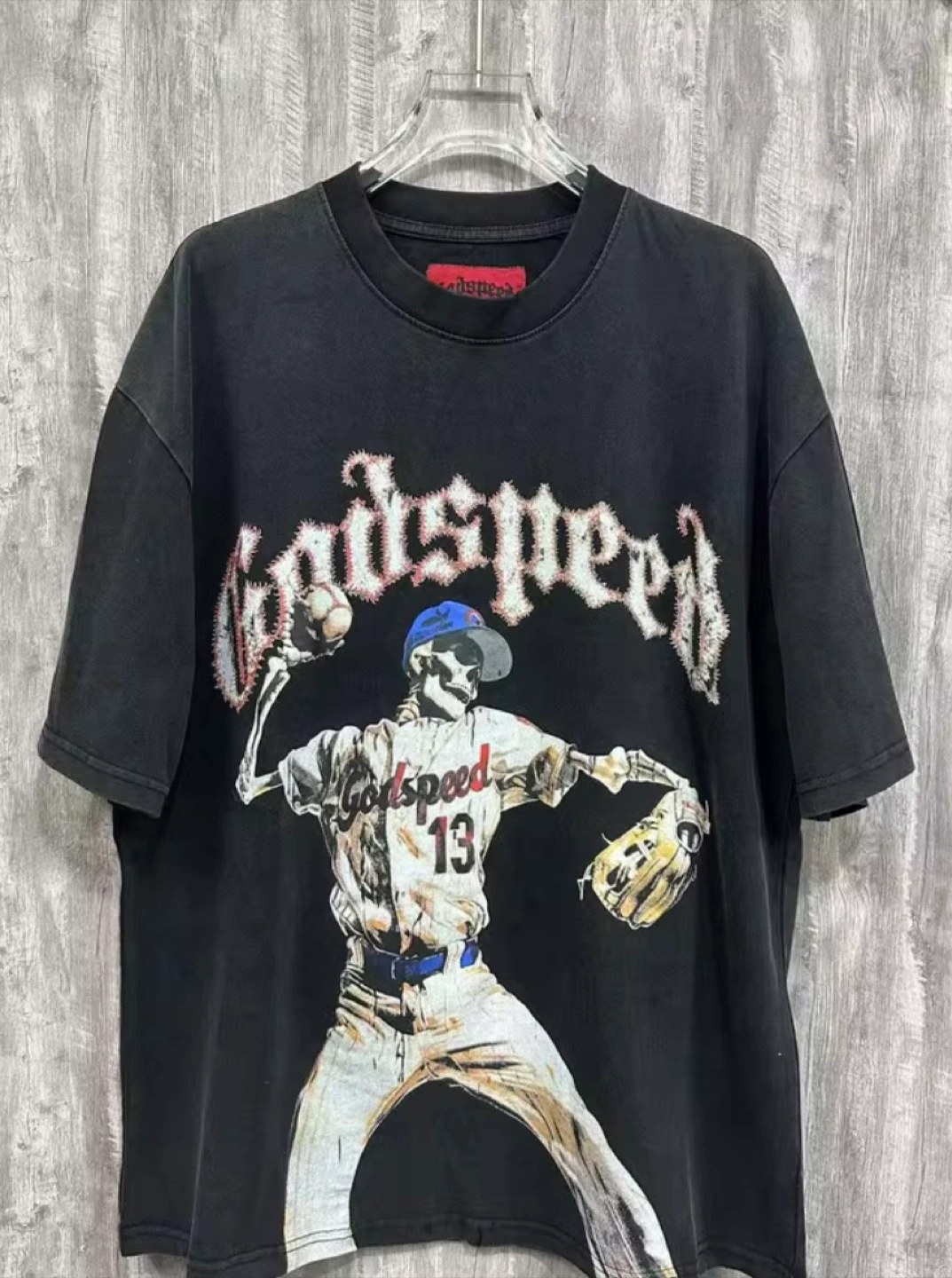 Here's a cool black graphic tee featuring a baseball-themed design with the word "Godspeed" on it! It looks to be in good condition and would be a great addition to your wardrobe