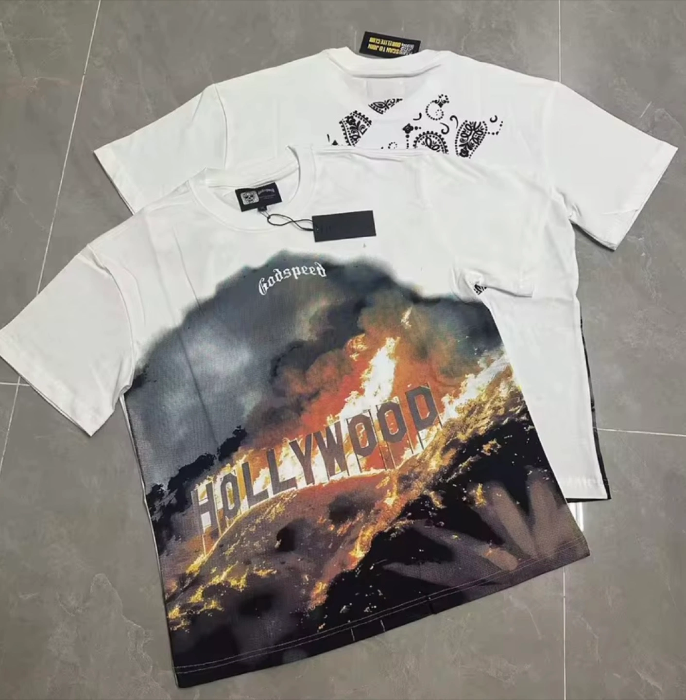 Cool white Godspeed t-shirt with a unique Hollywood graphic design! The graphic features a burning Hollywood sign, making it a standout piece. The back has a subtle paisley design. Perfect for adding some edge to your wardrobe