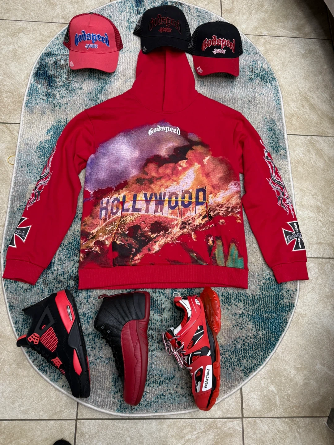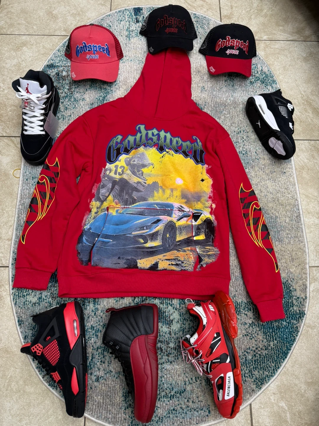 Selling a red Godspeed hoodie. It has a unique design and is in good condition. Perfect for casual wear!