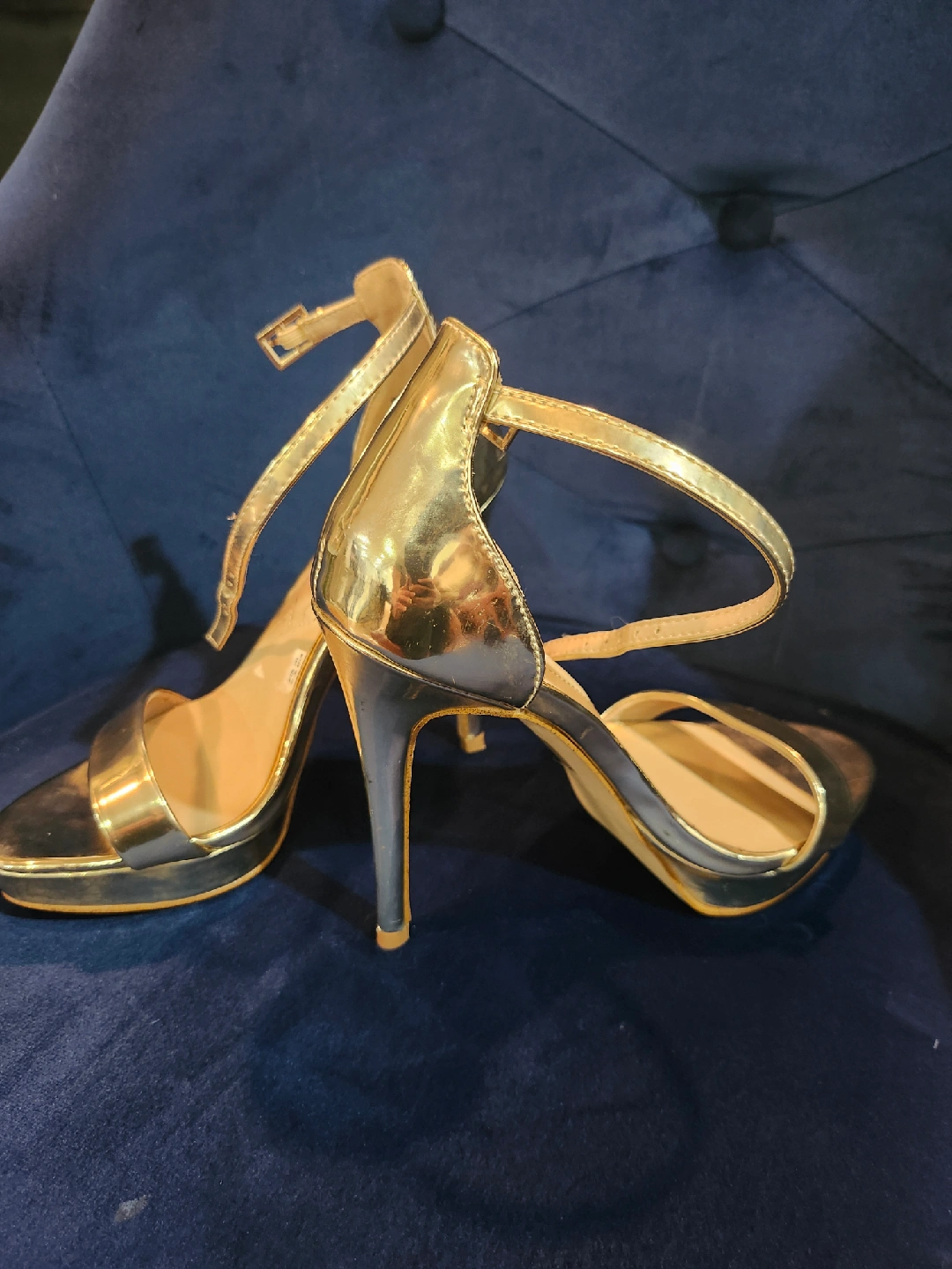 Selling a ALDO pair of gold ankle strap heels! They have a classic and elegant look that would be perfect for a special occasion or a night out. They are in good condition and ready for a new home