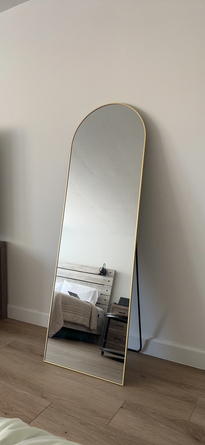 35Full-length standing mirror with gold frame and black stand, hardly used.