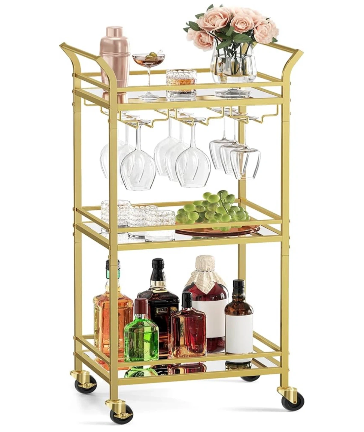 Selling a stylish gold bar cart! It has three tiers, perfect for storing drinks and glassware. The cart also has wheels, so it's easy to move around. Great for entertaining or adding a touch of elegance to your home. 11.81"D x 18.43"W x 36.22"H