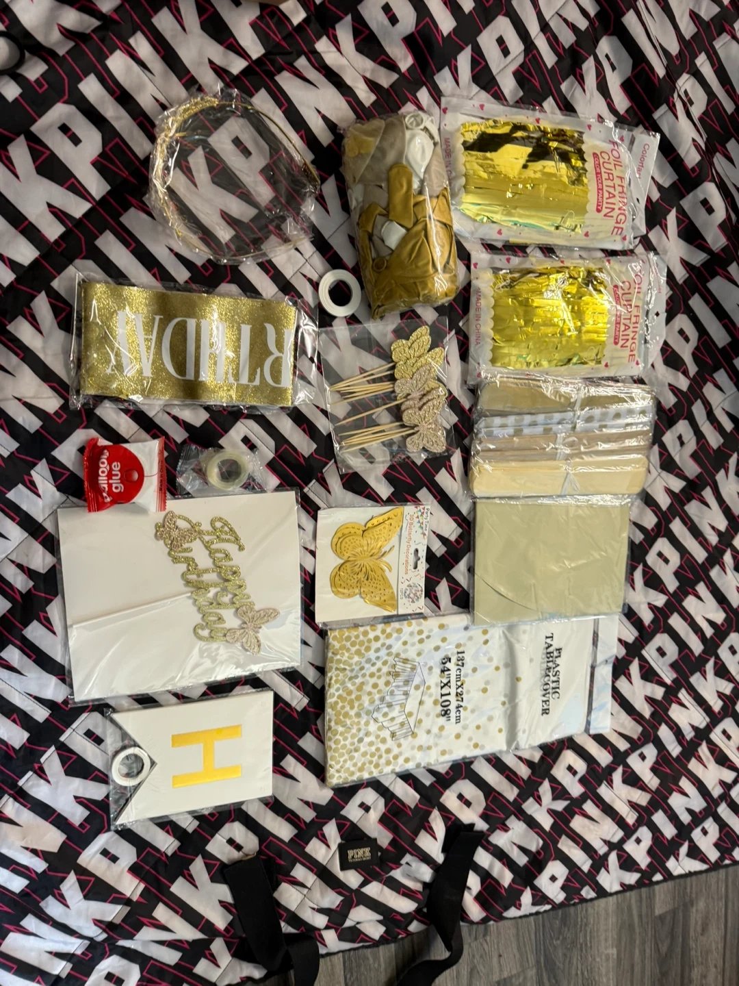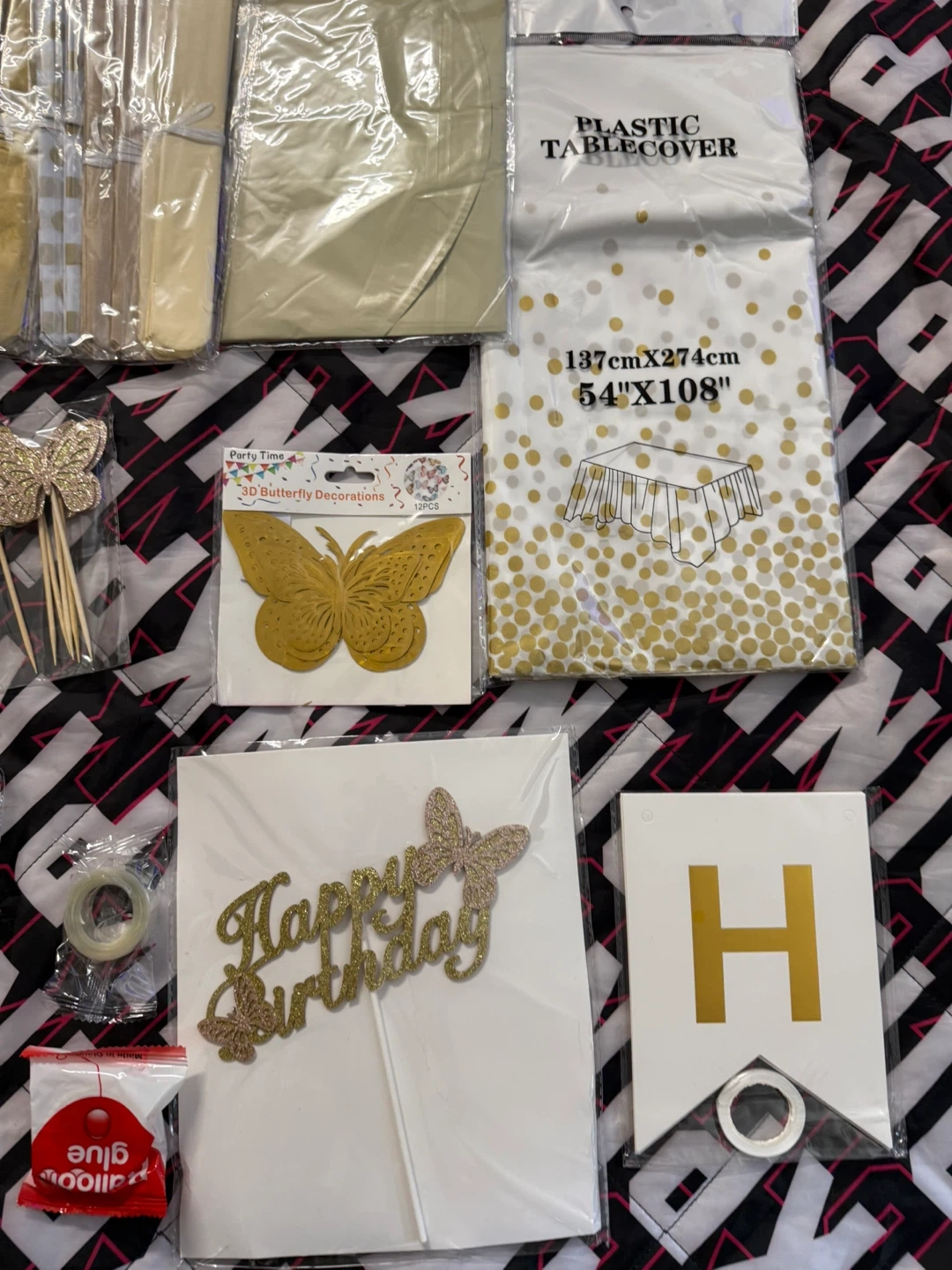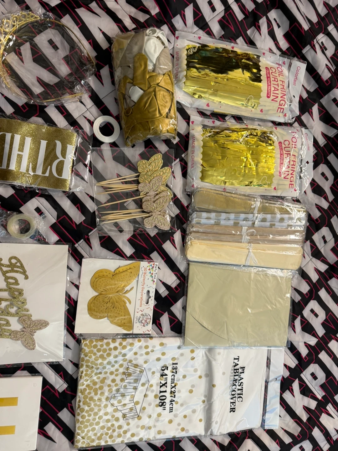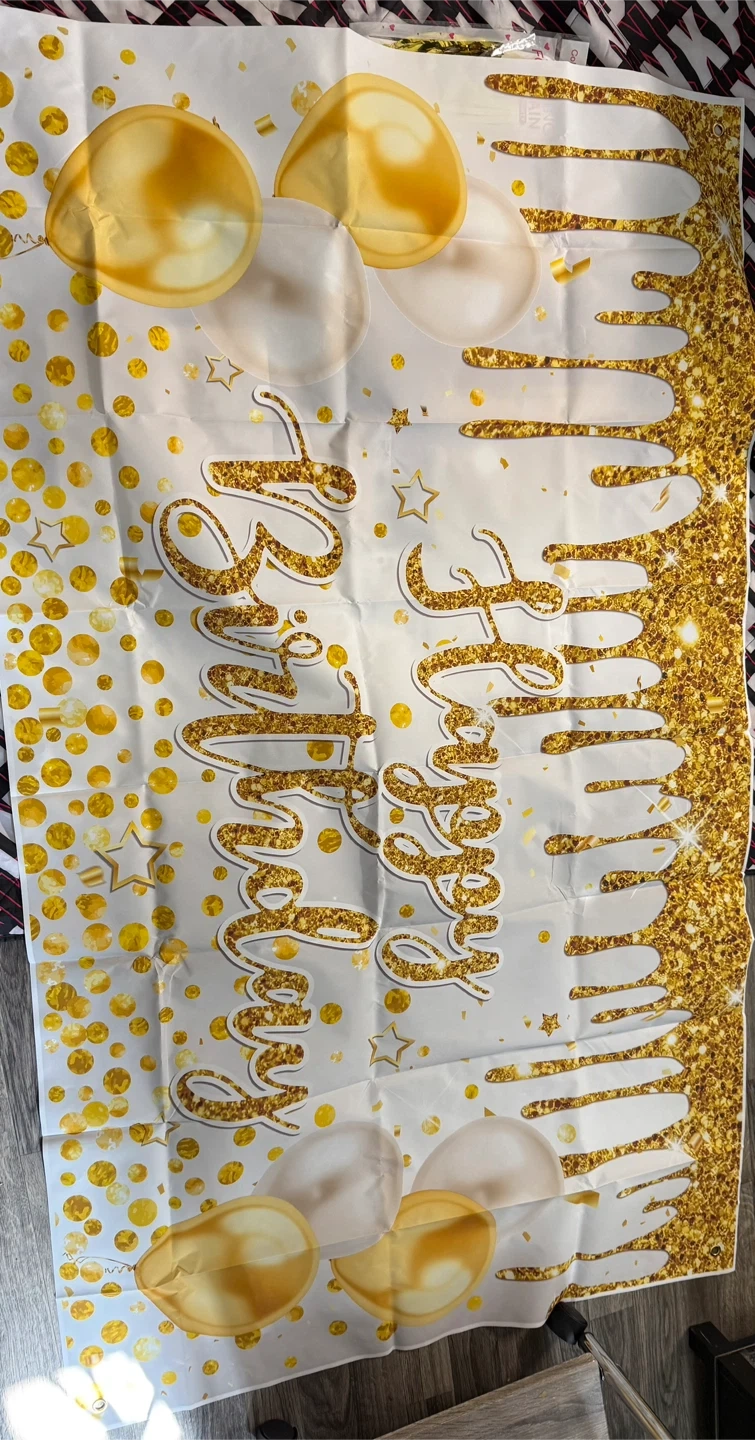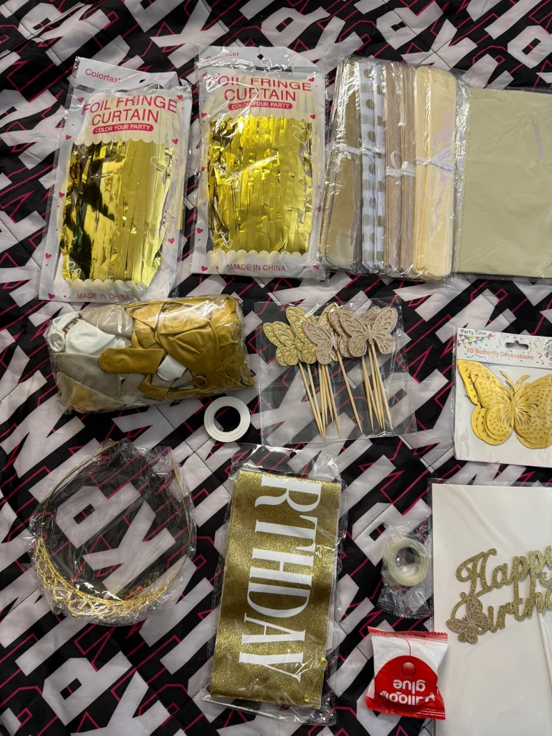 Get everything you need for a gold-themed birthday party in one set! Includes foil fringe curtains, cupcake toppers, a "Happy Birthday" cake topper, a plastic tablecloth (54"x108"), a birthday sash, and more! All items are new and ready to make your celebration sparkle