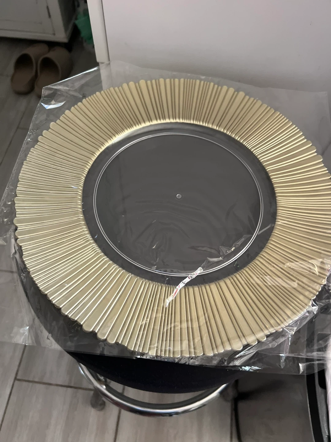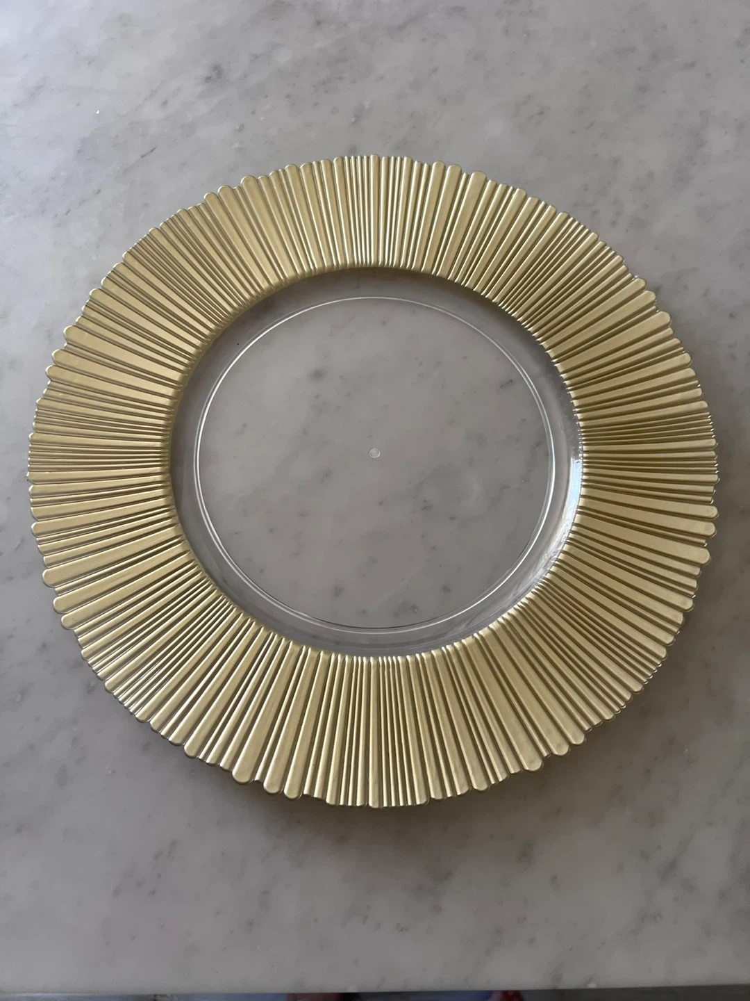 60Selling gold charger plates. They are in great condition and perfect for adding a touch of elegance to your event Qty. 100 pcs