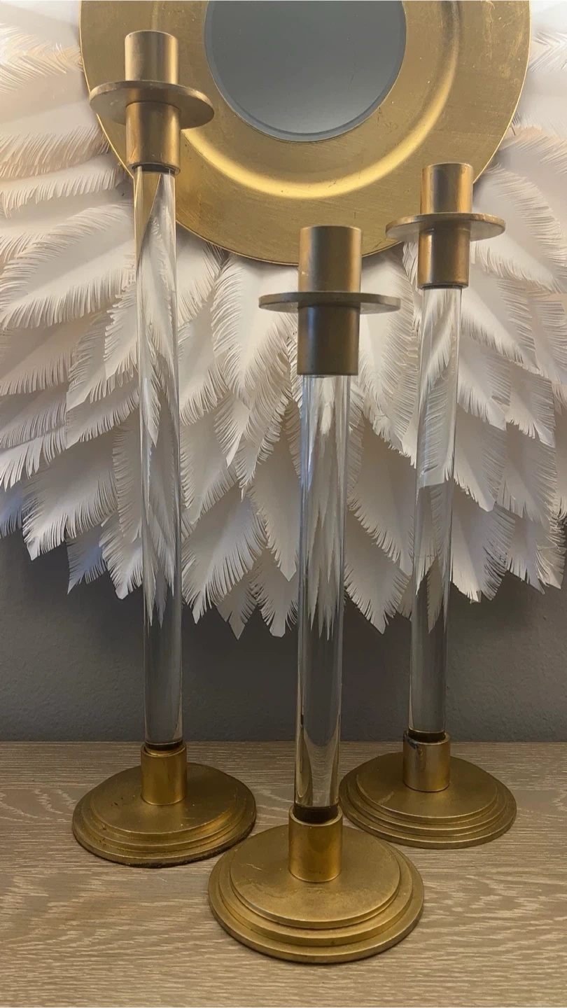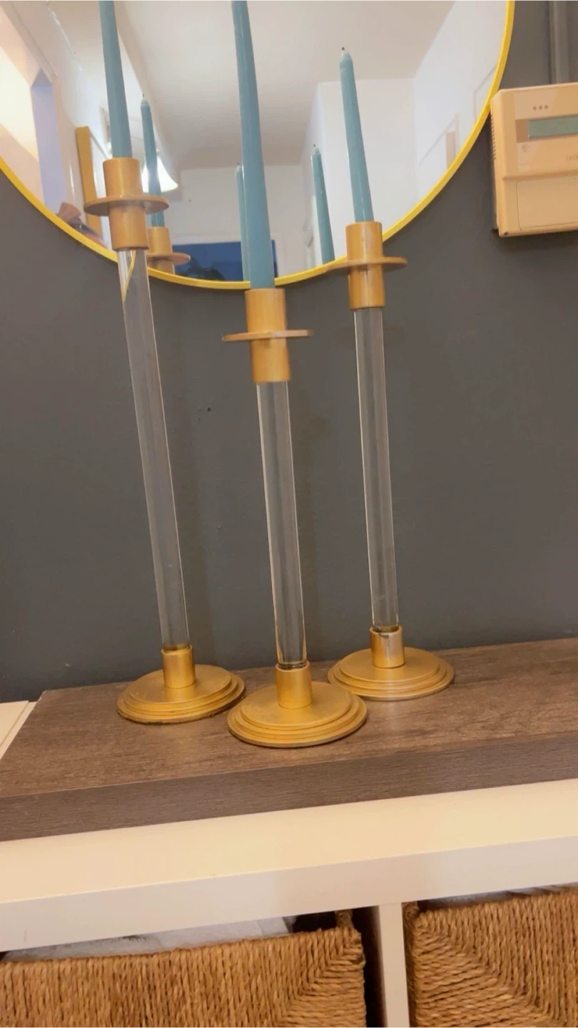 10Selling a set of three candlestick holders! They feature a gold base and top with a clear acrylic center. These would look great as a centerpiece or on a mantle