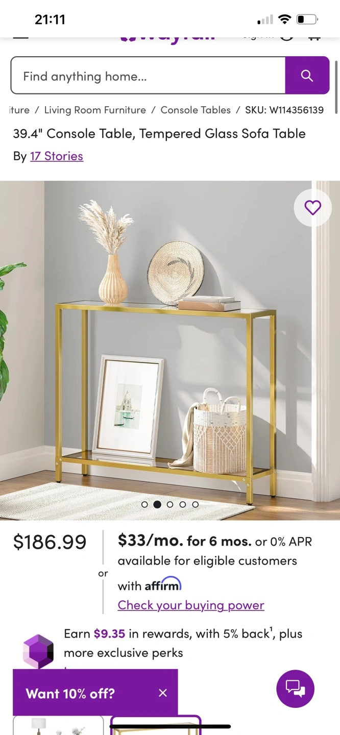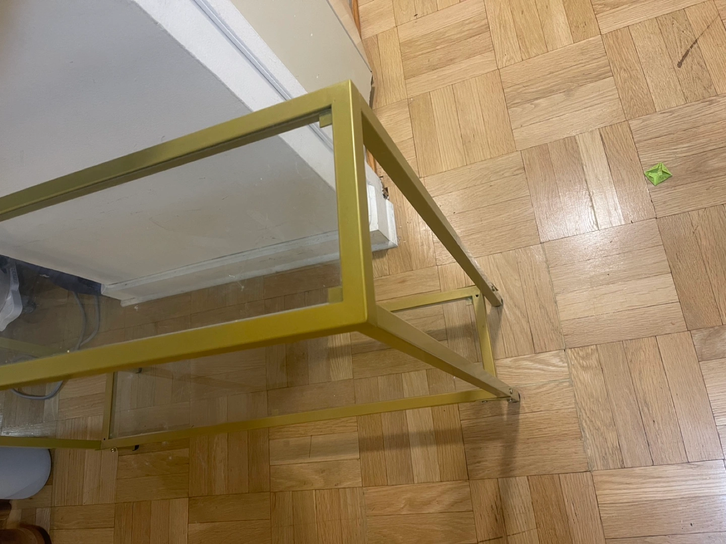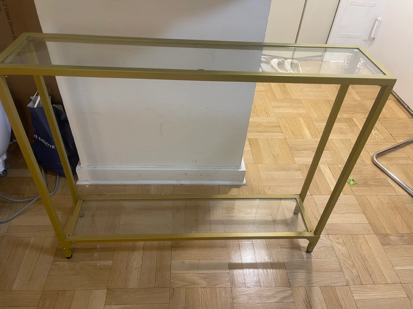 Selling a gold console table with a tempered glass top. It's perfect as a sofa table or for adding a touch of elegance to your living room. This table is sturdy and stylish, providing a great surface for decor or everyday use