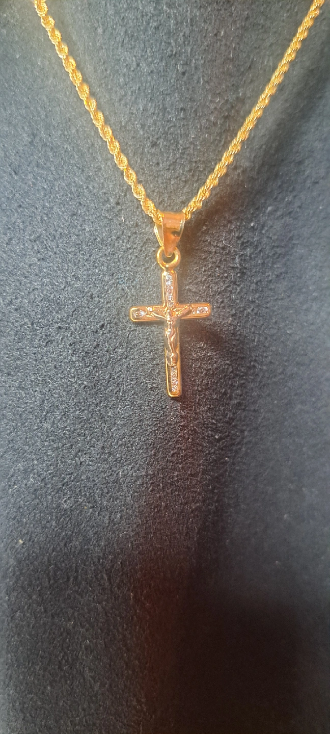 Selling a delicate gold cross pendant. The cross is adorned with small stones, adding a touch of sparkle. It's in great condition and ready to wear!