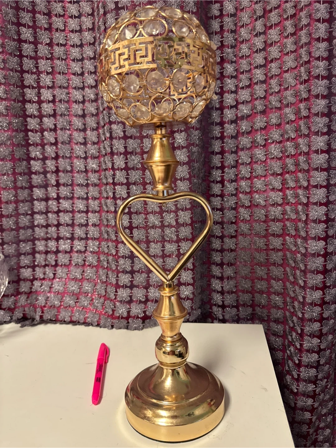 65Add a touch of elegance to your space with this gold-colored crystal candle holder! It features a beautiful design with clear crystals and a heart-shaped accent. Perfect for creating a warm and inviting atmosphere