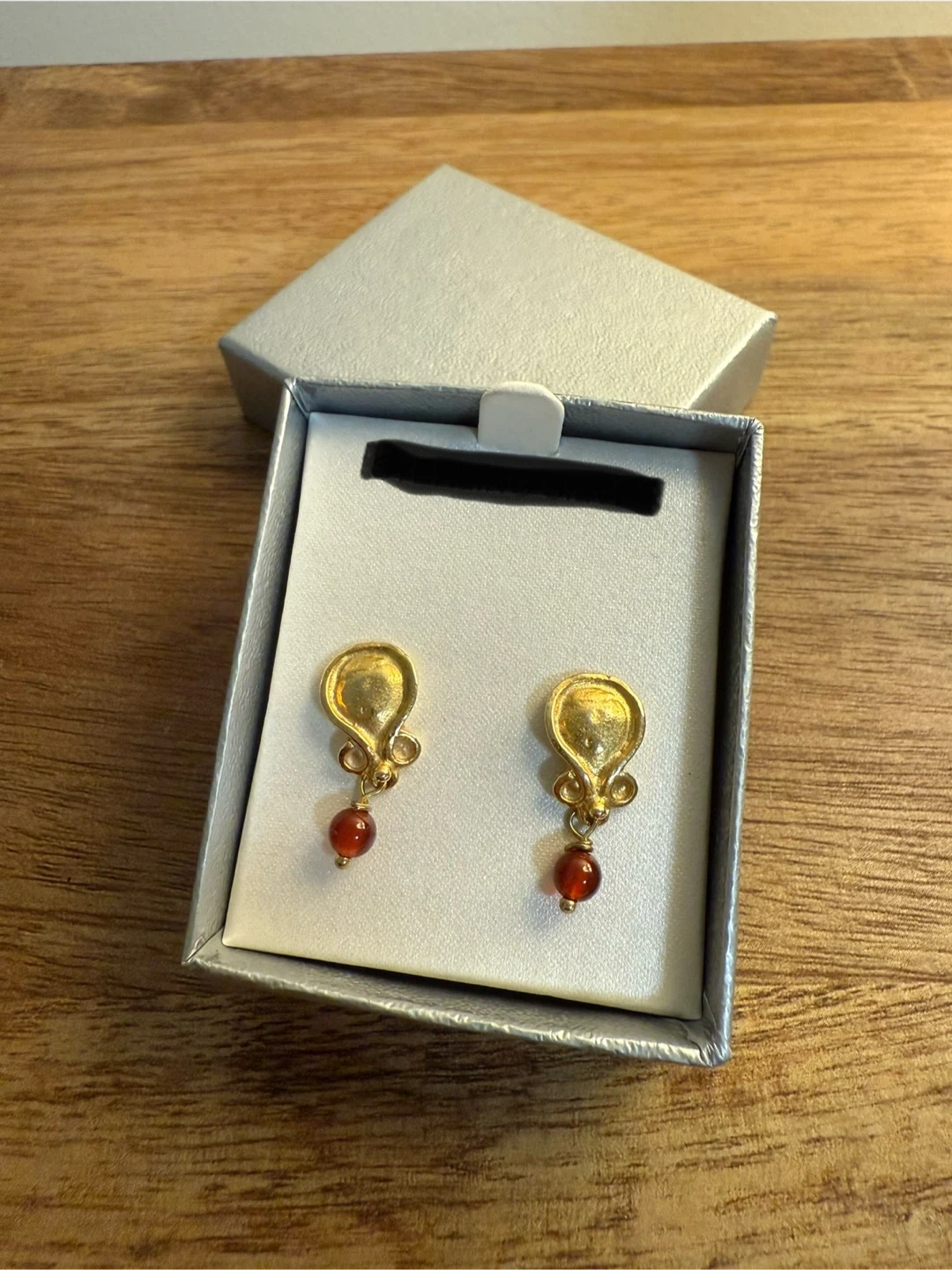 These are a pair of gold earrings with a red stone accent. They were bought in Paris so no brand but only worn once.
