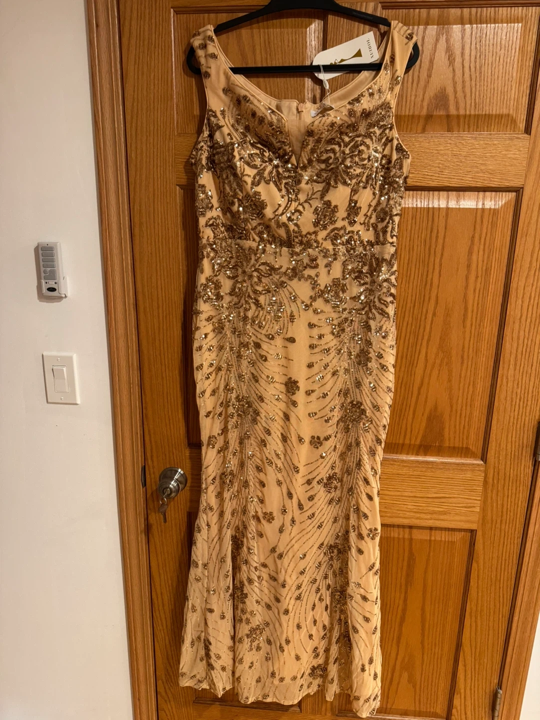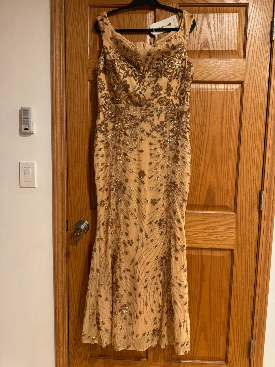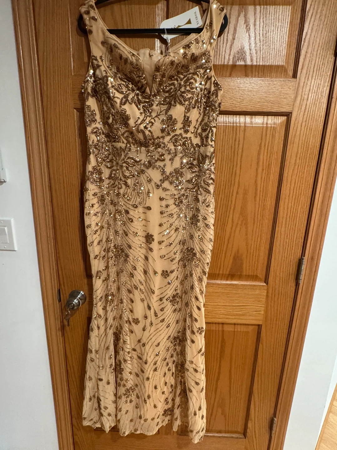 Beautiful gold formal dress with intricate embellishments! It's in great condition and perfect for a special occasion. The dress has a flattering silhouette and is sure to turn heads