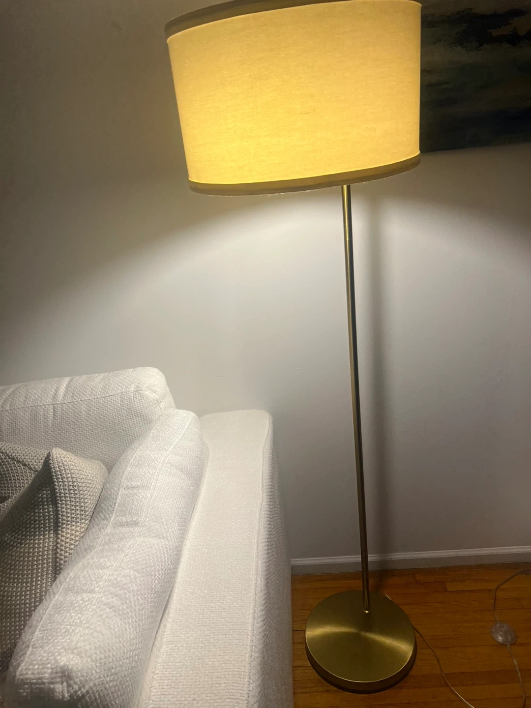 67Selling a gold-colored floor lamp. It has a simple design and would look great in any living room or bedroom. 62in tall with a on/off switch on the floor