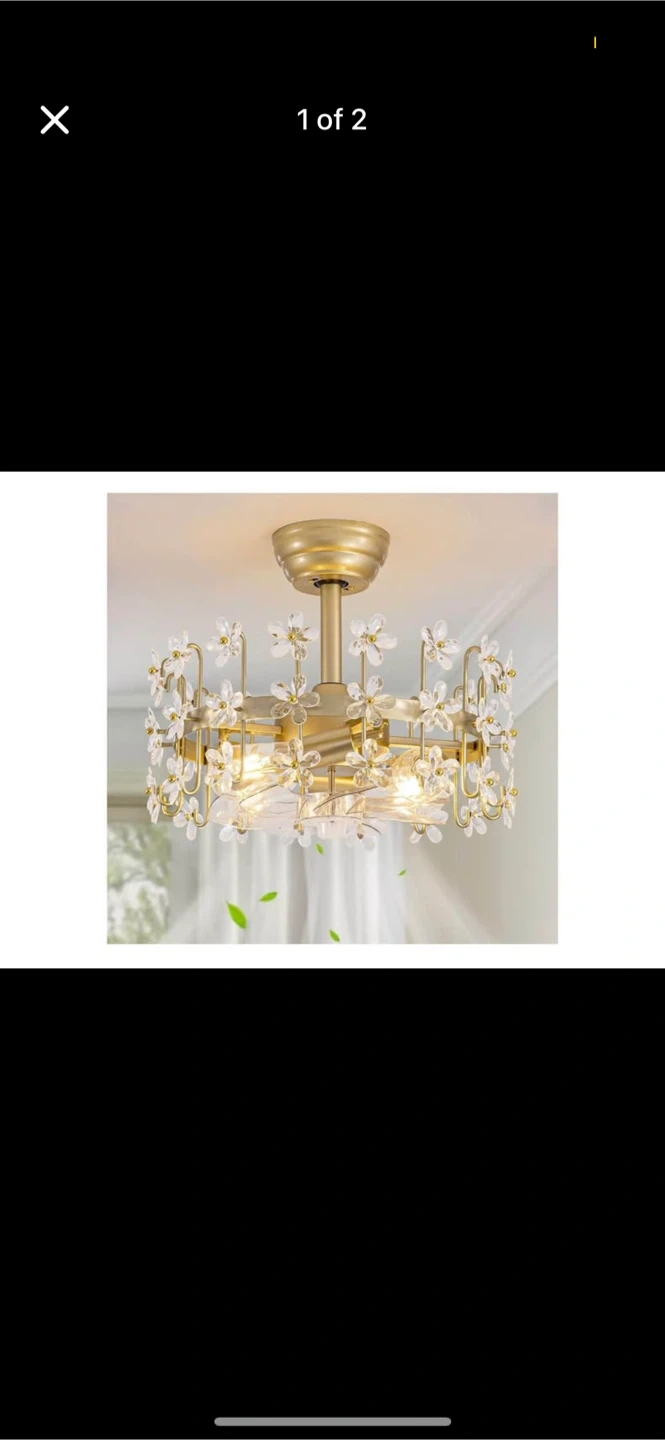 36This is a beautiful gold-colored ceiling fan with a crystal flower design. It's a unique and elegant lighting fixture that would add a touch of charm to any room!