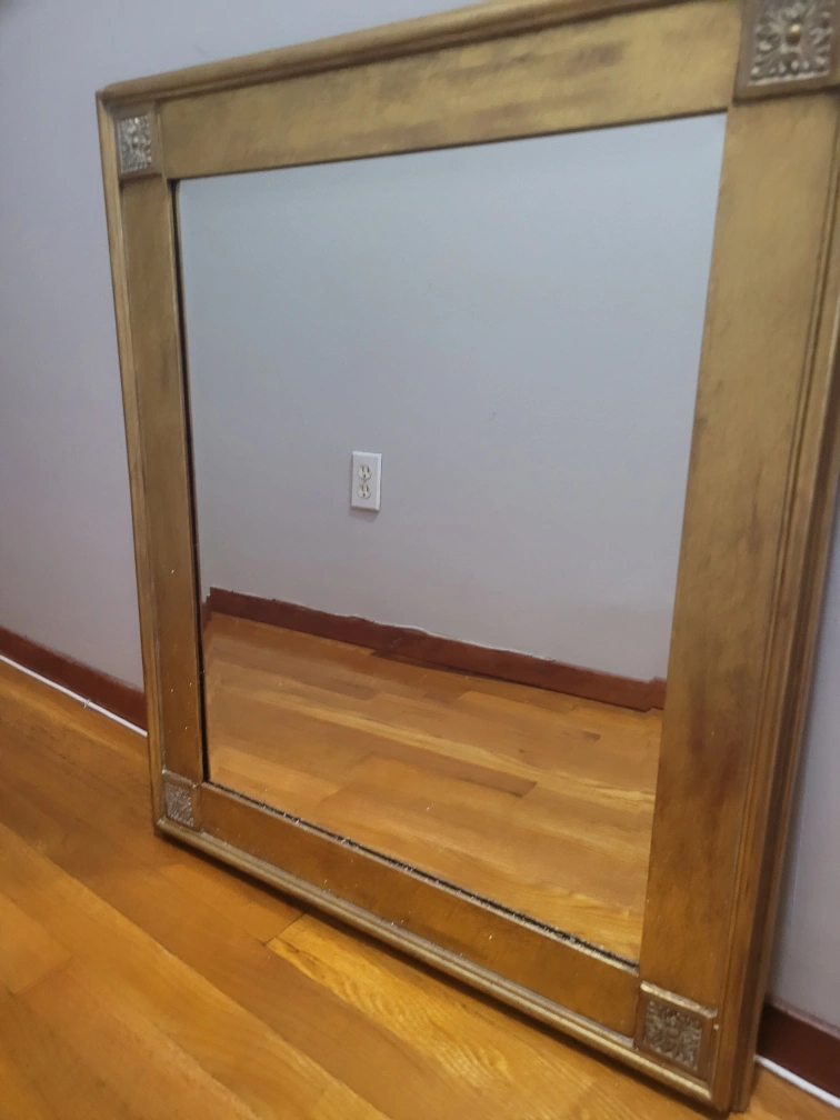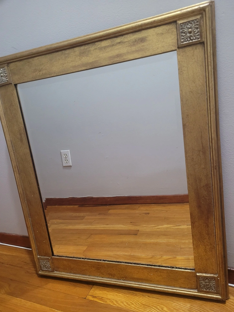 Selling a lovely gold framed wall mirror. It's in great condition and ready to brighten up any room! The frame has a decorative design that adds a touch of elegance