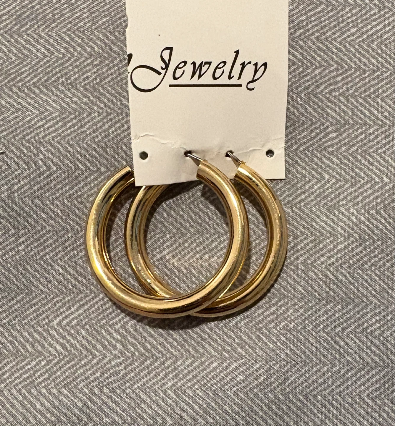 New pair of gold tone (not real gold) hoop earrings. They are new and ready for a new home!