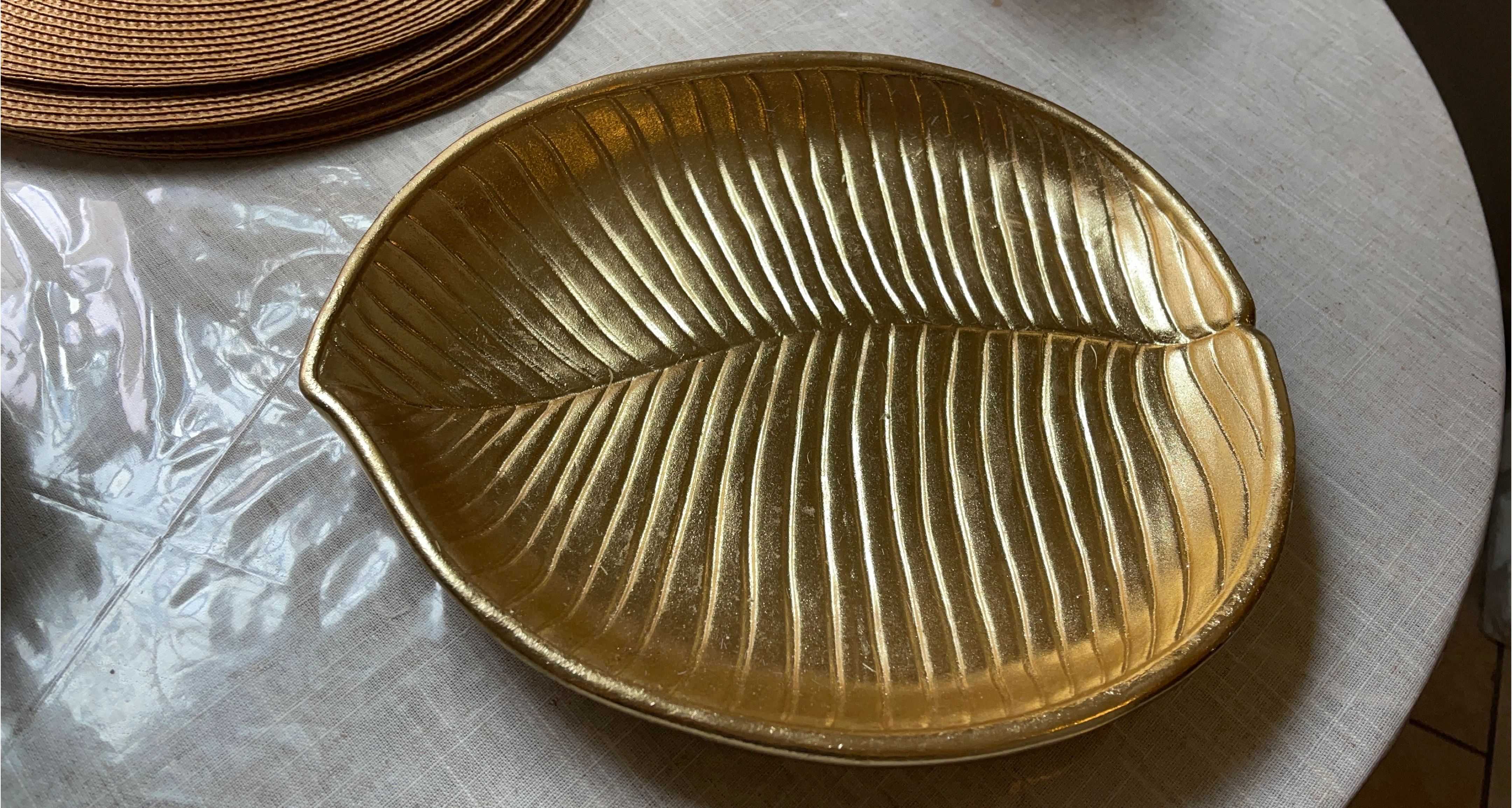 23Selling a decorative plate shaped like a leaf. It's a beautiful gold color and would look great as a centerpiece or accent piece in your home
