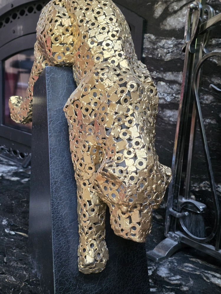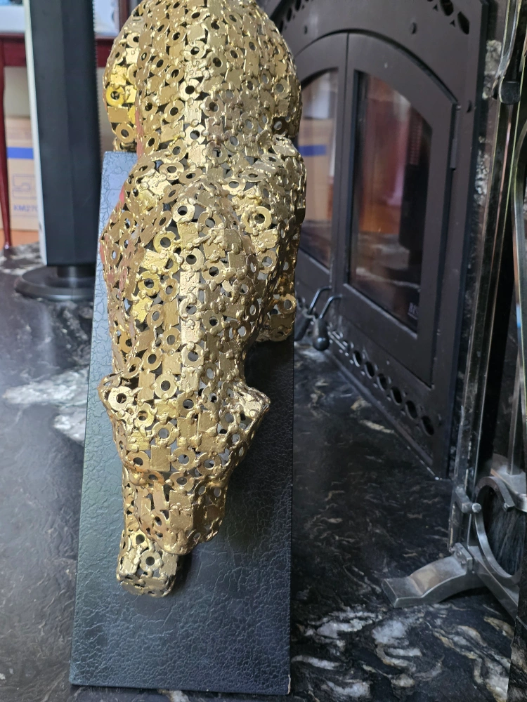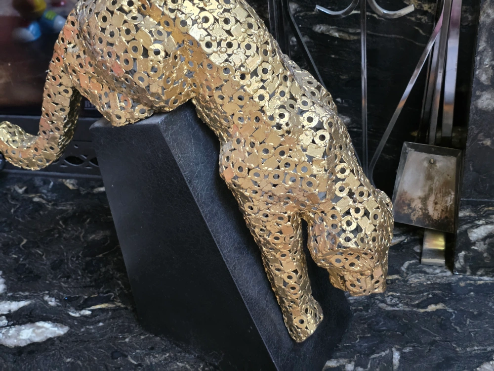 Unique gold-colored leopard sculpture. This eye-catching piece is perfect for adding a touch of wild elegance to any room. It's in great condition and ready to find a new home!