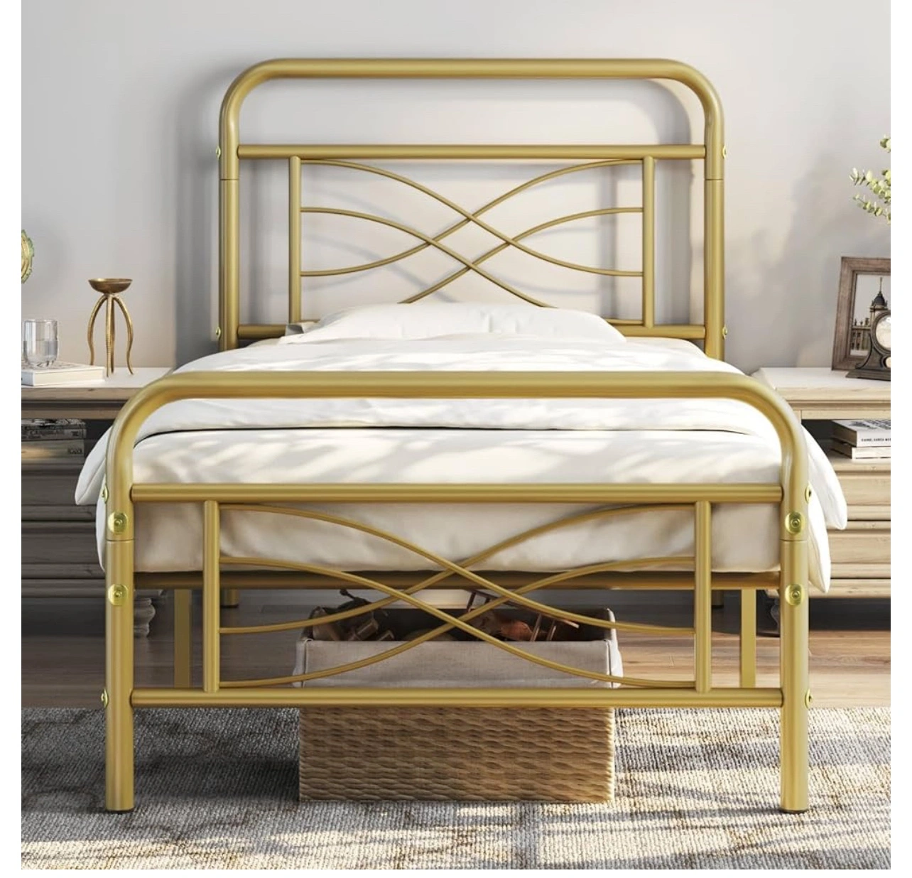Full-sized metal bed frame with a gold finish. The headboard features a curved design with a criss-cross pattern. The footboard has a similar design and the frame has a slightly curved, rounded design at the corners.